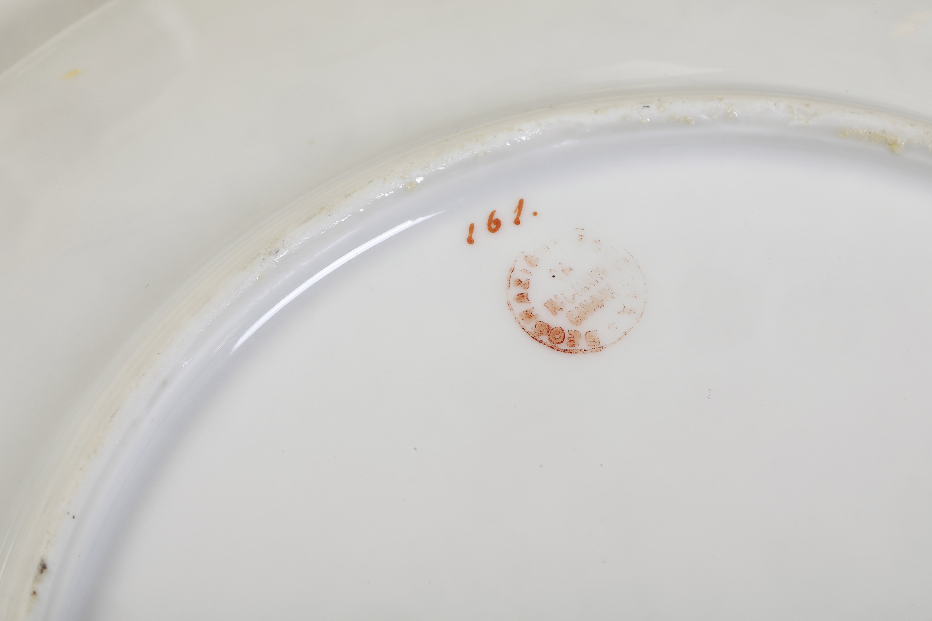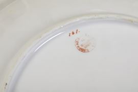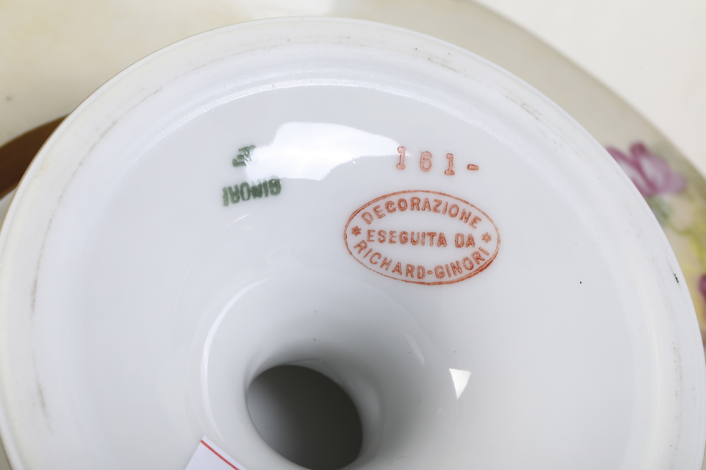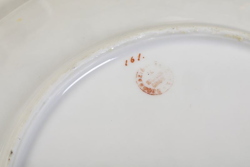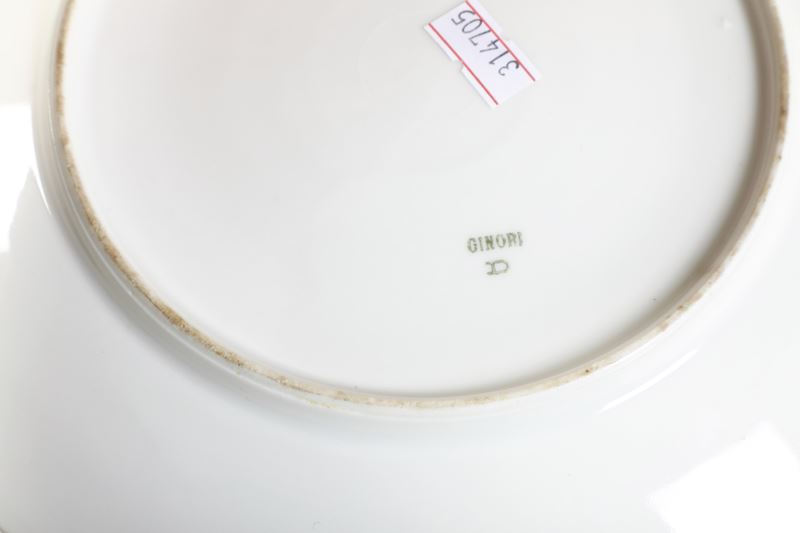Porcellana. Marca: “Ginori” e “D” in verde; timbro “Decorazione eseguita da Richard Ginori” in rosso. Dimensioni: diametro piatti cm 22,4; alzatine, altezza cm 8,2, diametro cm 22. Conservazione ottima; qualche insignificante usura all’oro