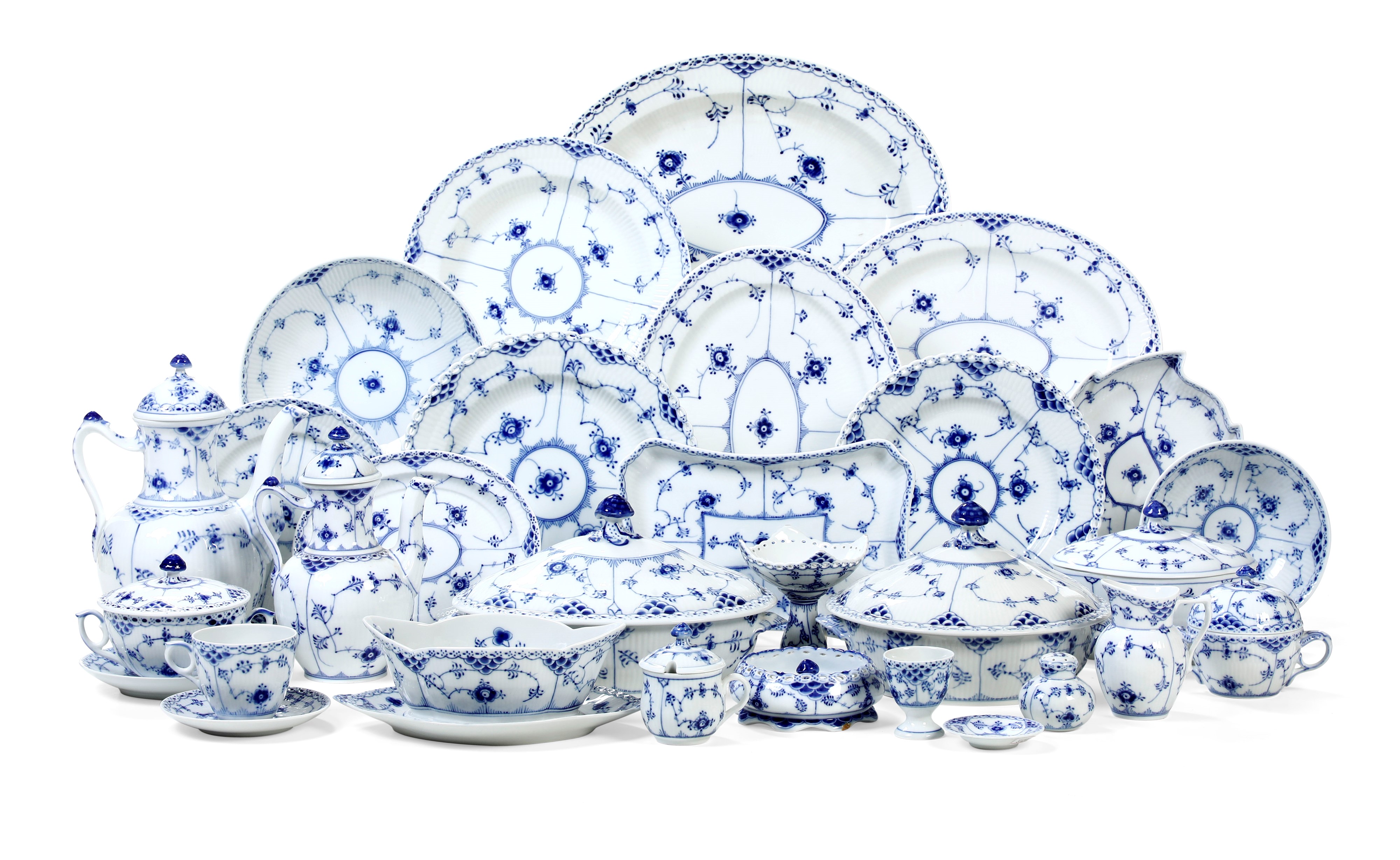 Dalle forme e dal decoro senza tempo, questo servizio è dipinto a mano in monocromia blu di cobalto, su superficie scanalata, con il motivo detto “Blue Fluted Full Lace”. Di ispirazione cinese viene creato a Copenaghen per la prima volta attorno al 1775 per poi essere rielaborato nella forma pittorica attuale dal direttore artistico Arnold Krog nel 1885