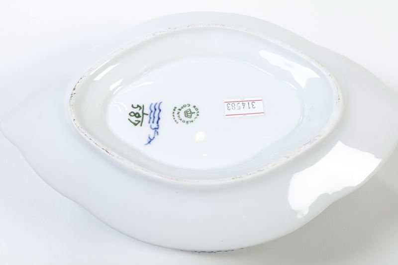 Porcellana. Marca: onde e lettere diverse in blu; “Royal Copenaghen Denmark” con corona in verde; numeri diversi tracciati in verde e incisi. Conservazione: ottima; piccole sbeccature e felature (vedi elenco)
