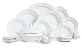 Il servizio per 18 persone conta 116 pezzi ed è così composto: 18 piatti fondi (diametro cm 23,4); 36 piatti piani (diametro cm 24,4); 18 piatti da dessert (diametro cm 22); 12 piattini per insalata a forma di mezzaluna (cm 23x13,5); 12 tazze da brodo con sottopiatto (altezza tazza cm 5,1; diametro sottopiatto cm 18,1); 1 zuppiera (altezza cm 19,5; lunghezza cm 34); 2 insalatiere (altezza cm 10,5; diametro cm 25); 2 piatti da portata tondi (diametro cm 31,5); 2 piatti da portata ovali (lunghezza cm 34); 12 tazze da caffè con 15 piattini (altezza tazza cm 6,3; diametro piattino cm 13); 1 zuccheriera (altezza cm 14,5)