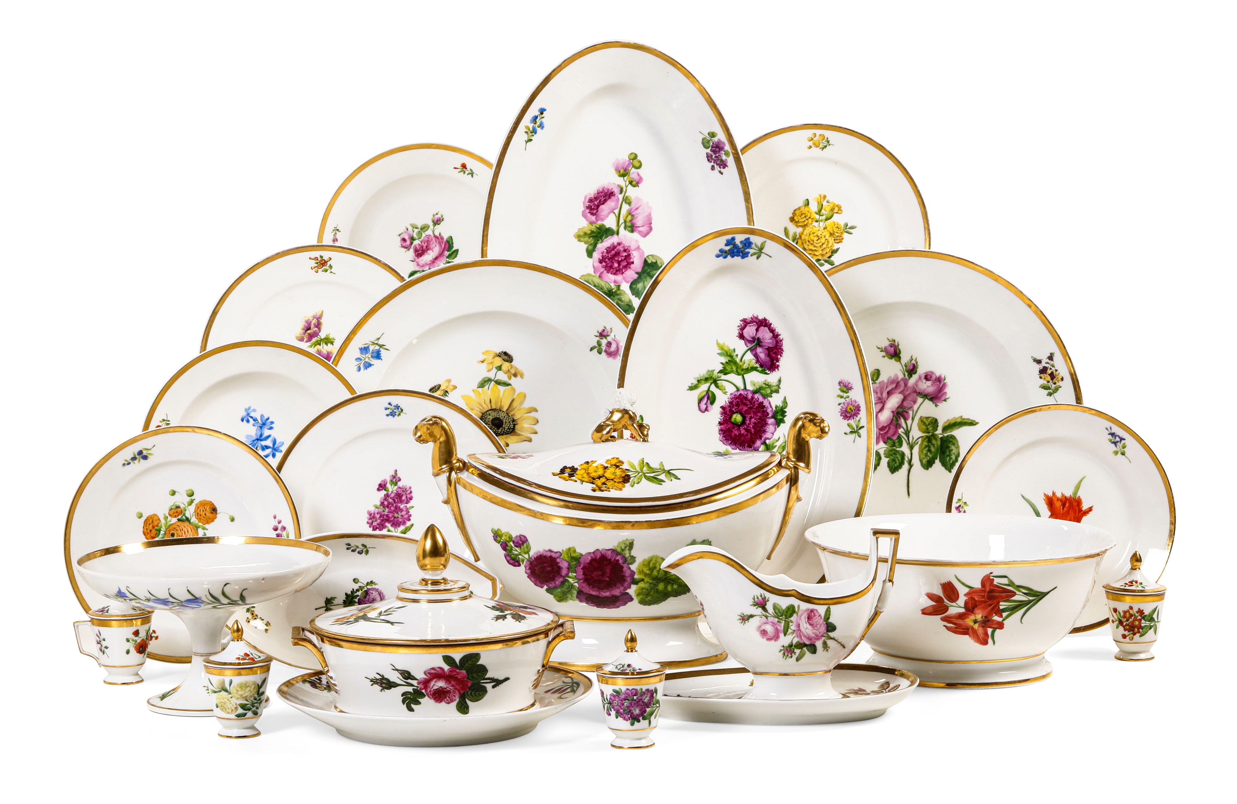 Porcellana. Marca: “Denuelle Rue de Crussol à Paris” in rosso, sotto alcuni pezzi. Conservazione: ottima; un piatto piano e un vassoio ovale con piccola sbeccatura; usure all’oro e alla policromia dei fiori
