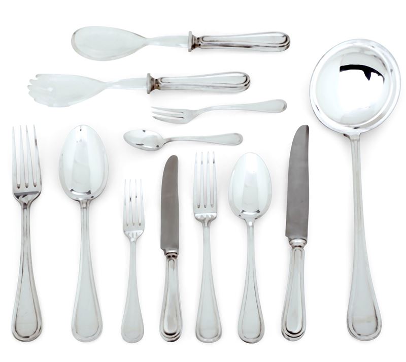 composto da 12 forchette, 12 coltelli, 12 cucchiai, 12 forchette e 12 coltelli da frutta, 12 forchettine e 12 cucchiaini da dessert, 5 posate da portata