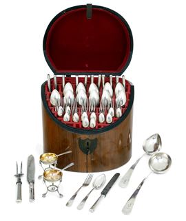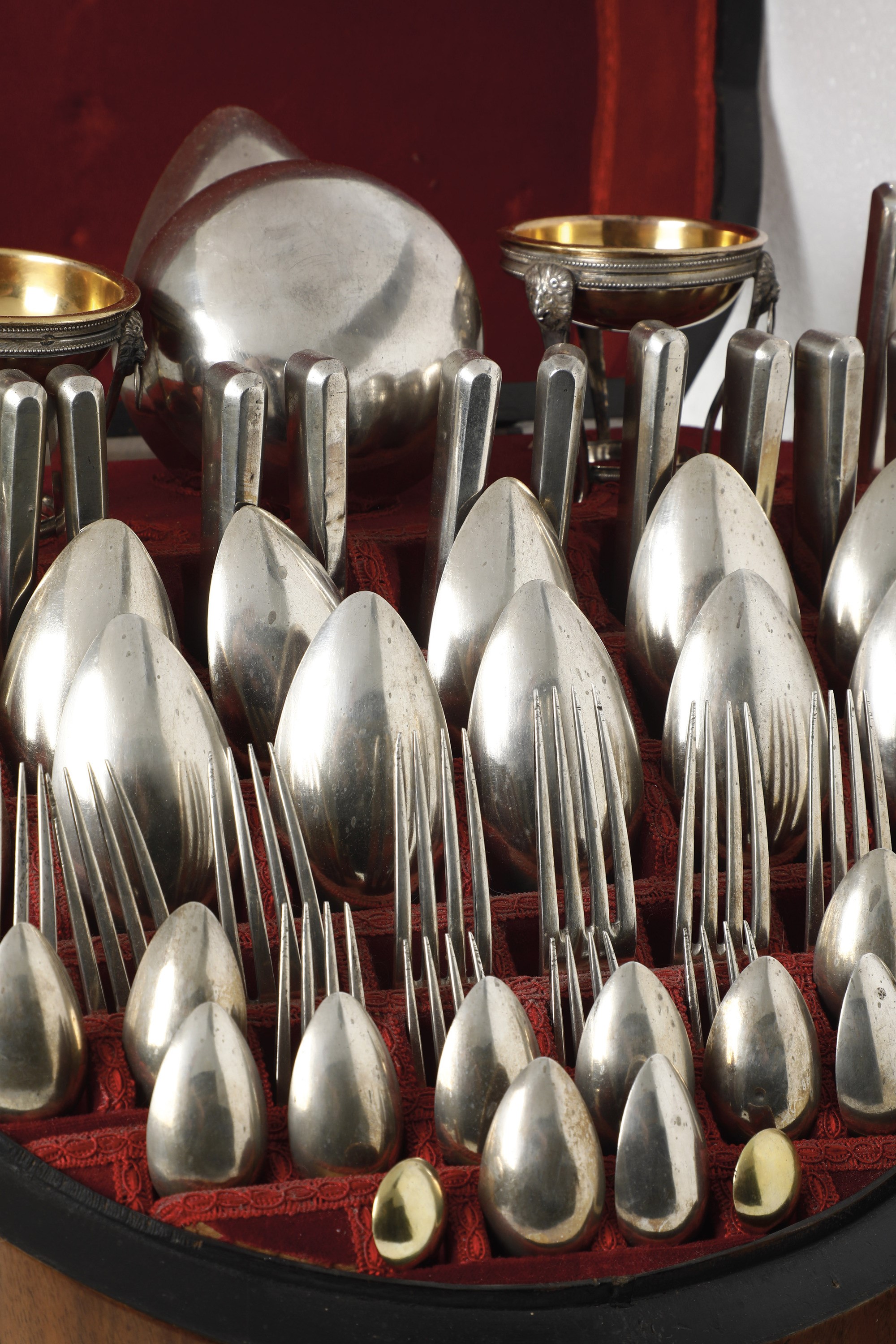 Composto da due saliere a tripode con cucchiaini, coltello e forchettone da carne, cucchiaio da riso, mestolo, dodici coltelli, dodici cucchiai, dodici forchette, dodici cucchiaini da dessert. Sui manici inciso a cesello monogramma FC.