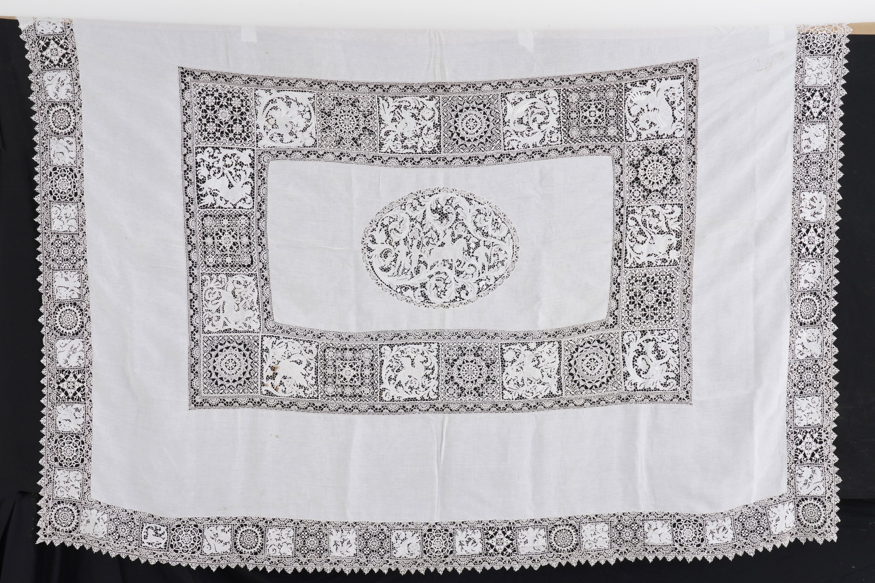 In lino e pizzo con decorazione a motivi vegetali, rocailles e riserve con figure mitologiche fra cui fauni e grifoni.