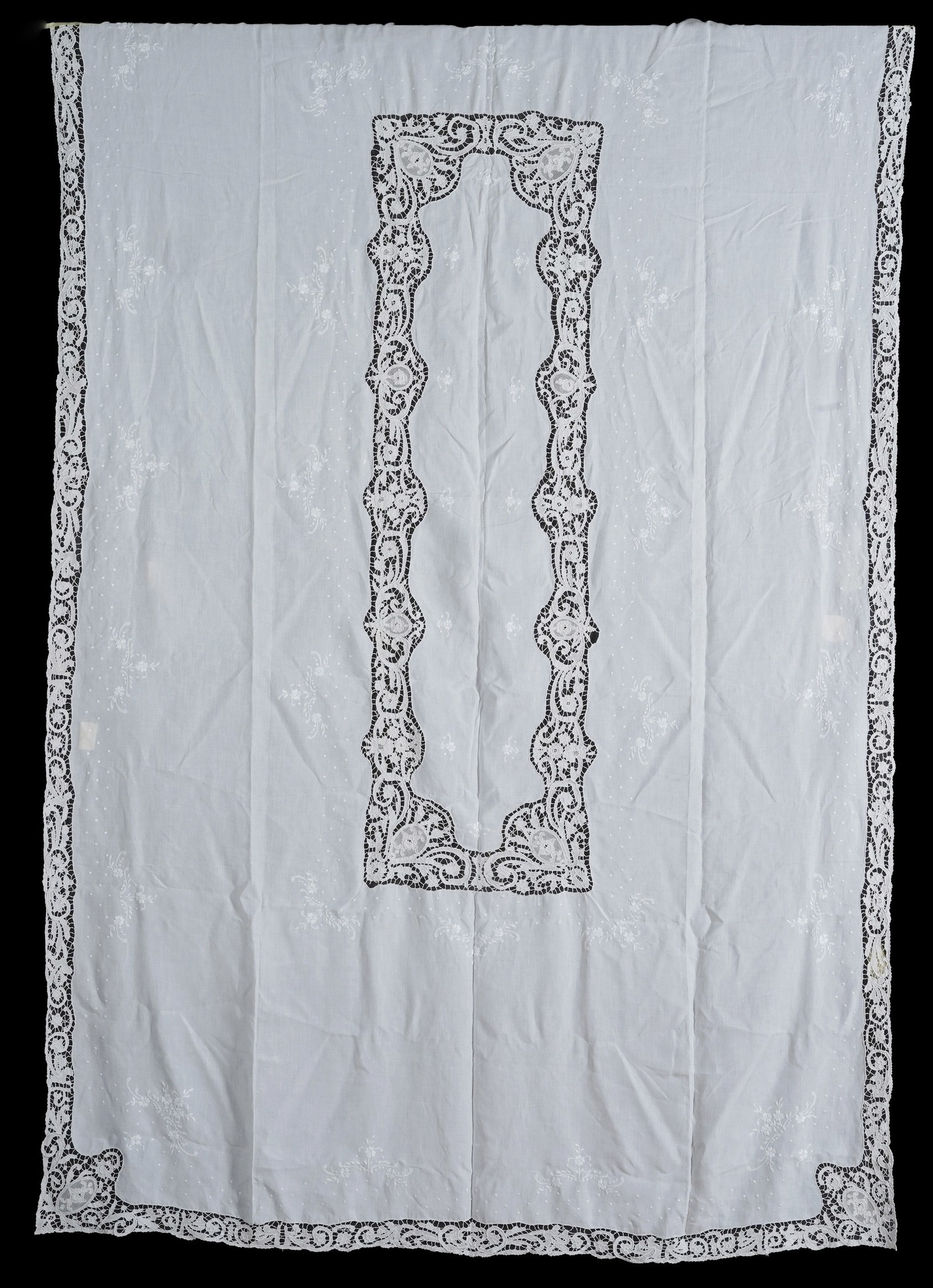 In lino bianco con bordo in pizzo a motivi vegetali e floreali. Tovaglia cm 175x288; tovaglioli cm 39x39. Conservazione: ottima