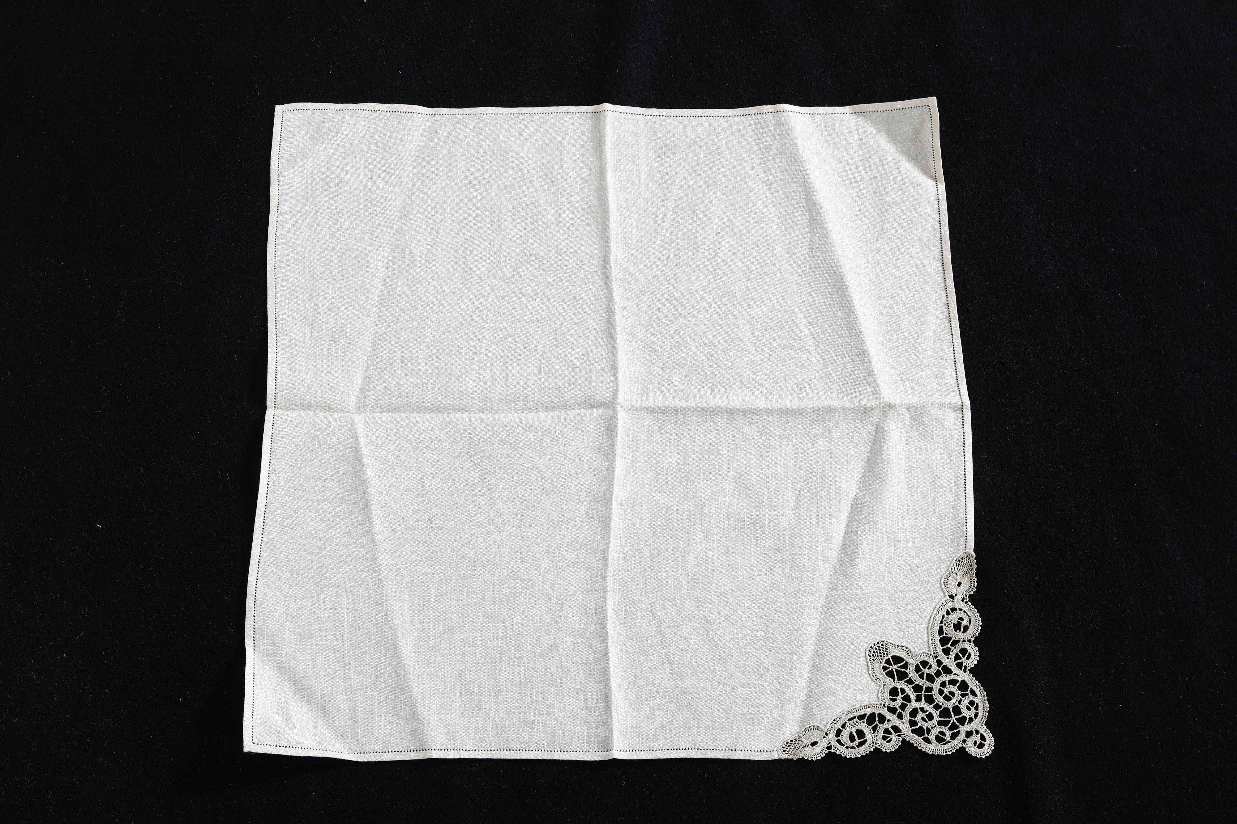 Lino écru con inserti al tombolo. Tovaglia cm 280x240; tovaglioli cm 41x41.Conservazione: qualche leggera macchia