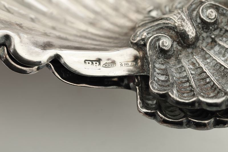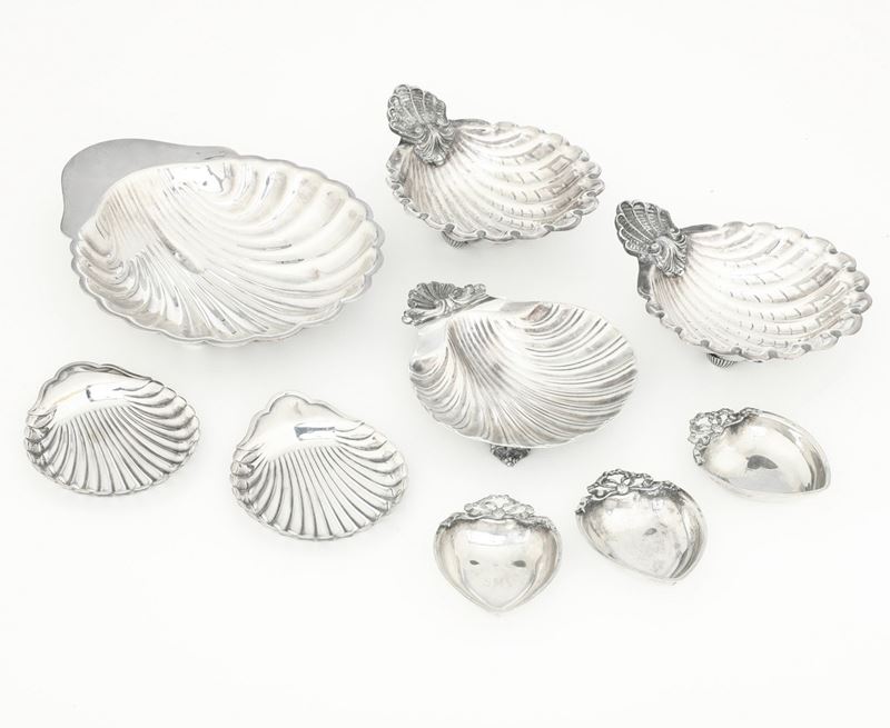 Insieme di tre conchiglie Christofle, tre conchiglie in argento di cui due argentiere Brandimarte, Firenze e tre ciotoline [..]