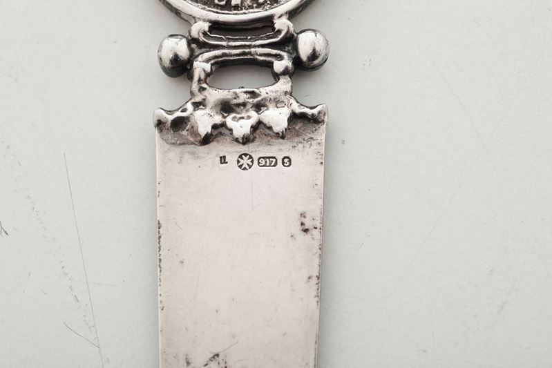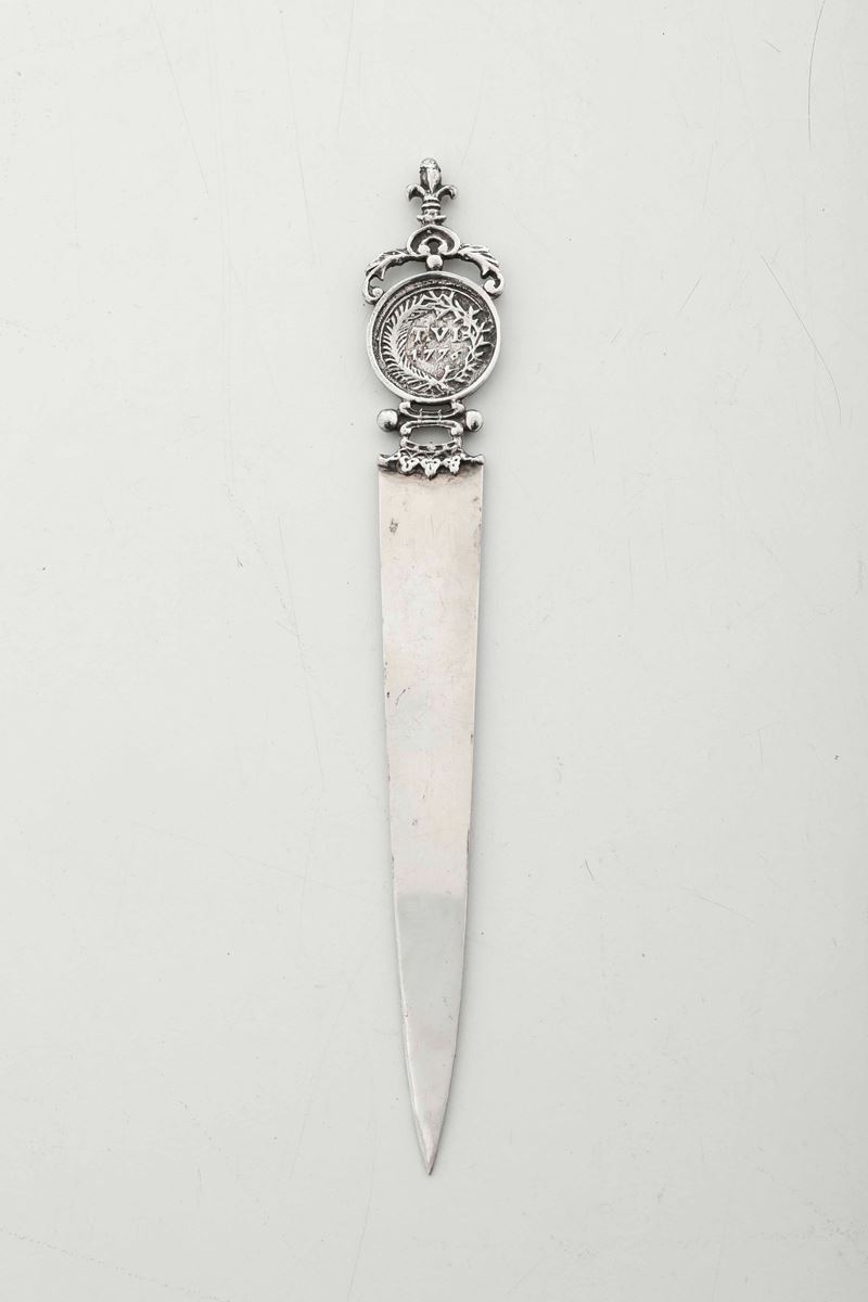 Tagliacarte. Argento fuso, traforato e cesellato. Marchio non identificato.