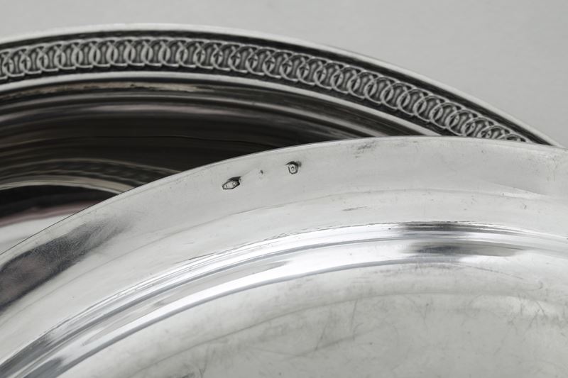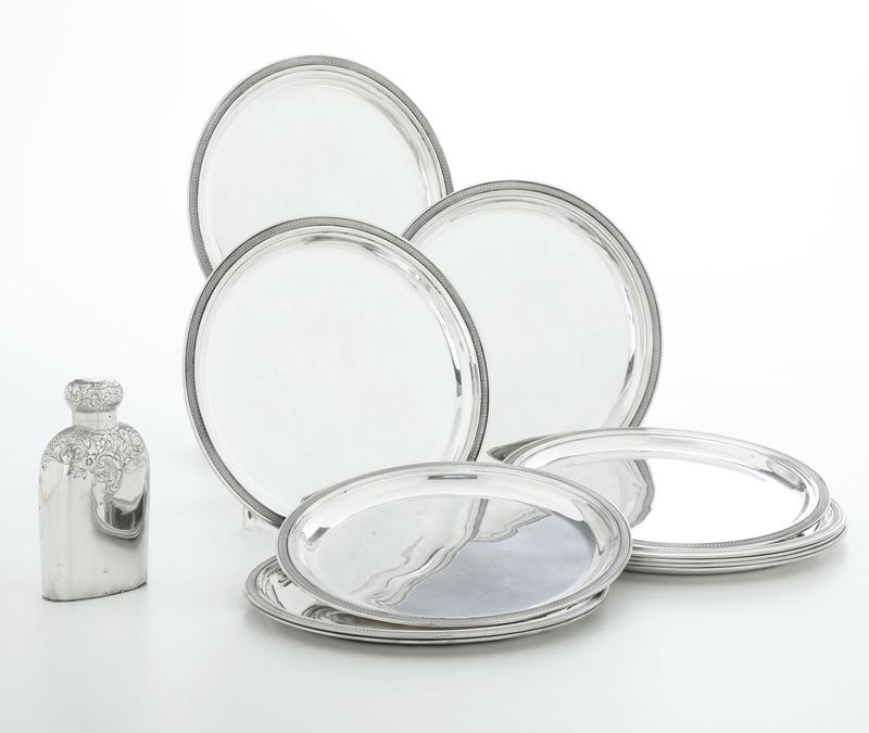 Undici piatti argento e una fiaschetta. Argenteria italiana del XX secolo