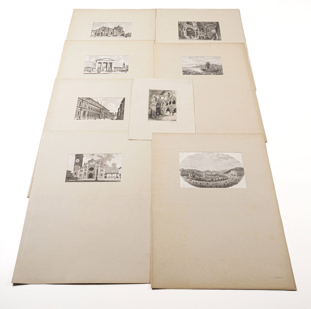 Molte di queste incisioni rappresentano scorci e vedute di città italiane e sono conservate entro paspartout