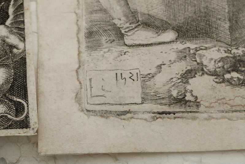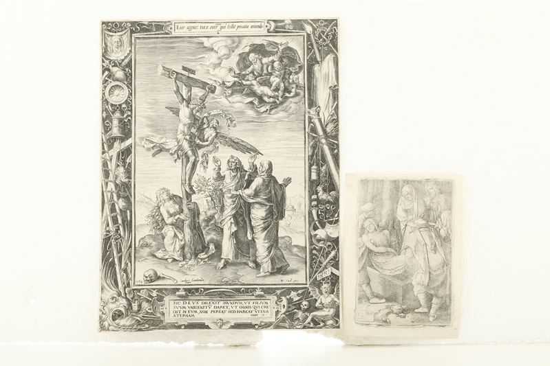 Stampata su carta velina vergellata molto sottile. Si aggiunge al lotto: Luca di Leida, deposizione di Cristo nel sepolcro. Impressione staca, esemplare rimarginato