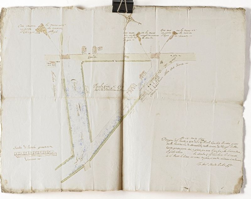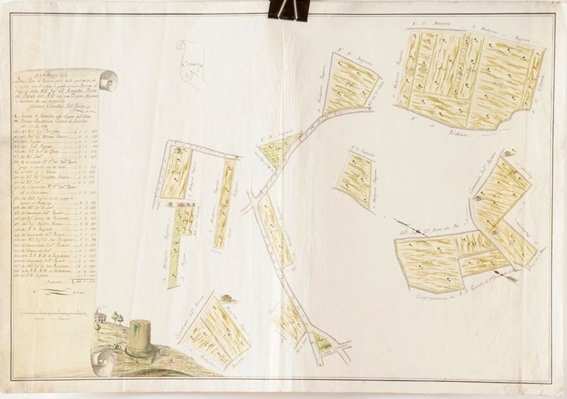 Due mappe tratte da cabrei diversi Mappa manoscritta e acquerellata di porzione di terreno agricolo datata 1688- altra mappa di possedimenti agricoli, compilata dal perito agrimensore e datata 24 maggio 1772