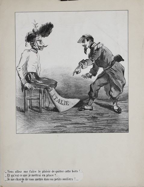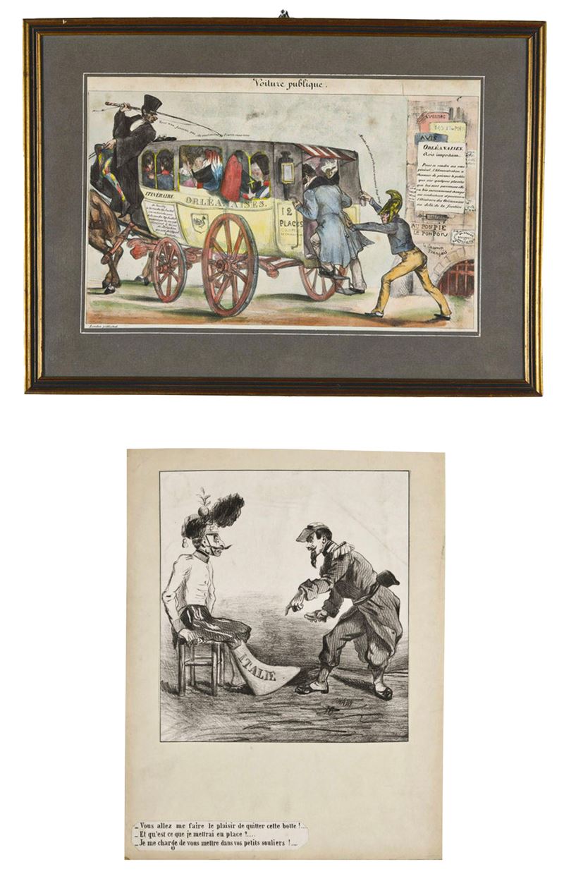 La prima incisione (entro cornice), dal titolo Voiture Publique. Itineraire Orleanaises, è di carattere politico e satirico e presenta una bella coloritura coeva. Si aggiunge nel lotto altra litografia, con riferimento alla questione risorgimentale italiana