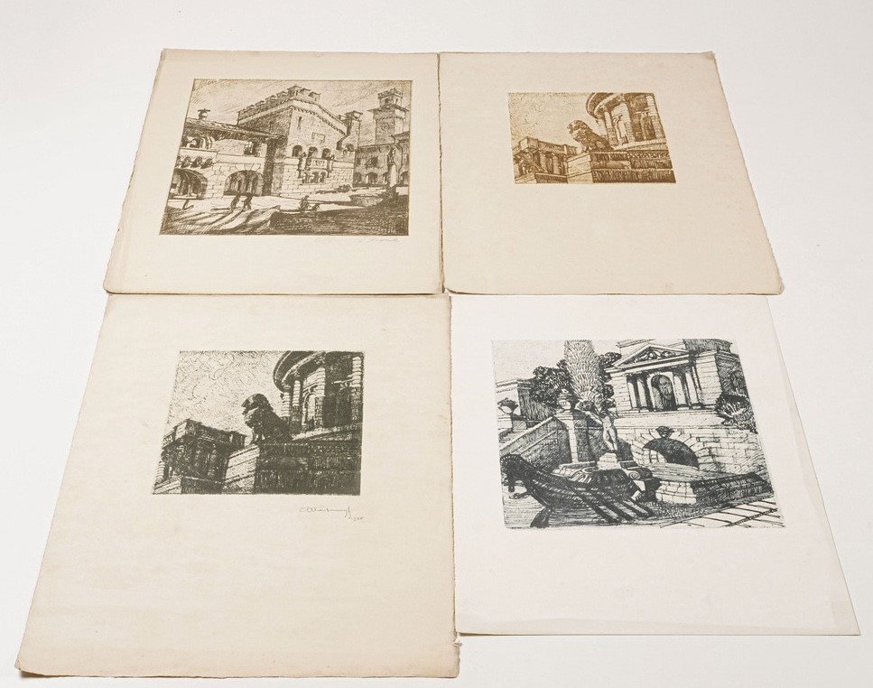 Martinenghi Giuseppe Roberto (Londra, 27 dicembre 1894 – Milano, 13 ottobre 1970) Settantadue stampe multiple in xilografia stampate a colori differenti raffiguranti scorci di città storiche veri e d'invenzione, Anni trenta del secolo XX.