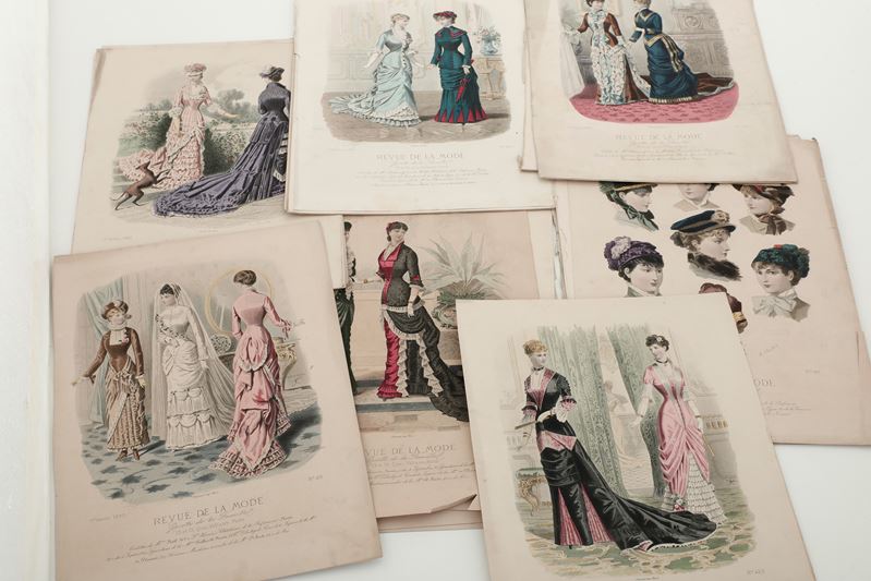 Raccolta di 54 figurini di moda provenienti dalla rivista francese "Revue de la mode" si aggiungono nel lotto altre 40 tavole fotografiche in bianco e nero riproducenti pizzi e merletti provenienti da un'edizione veneziana della prima metà del secolo XX