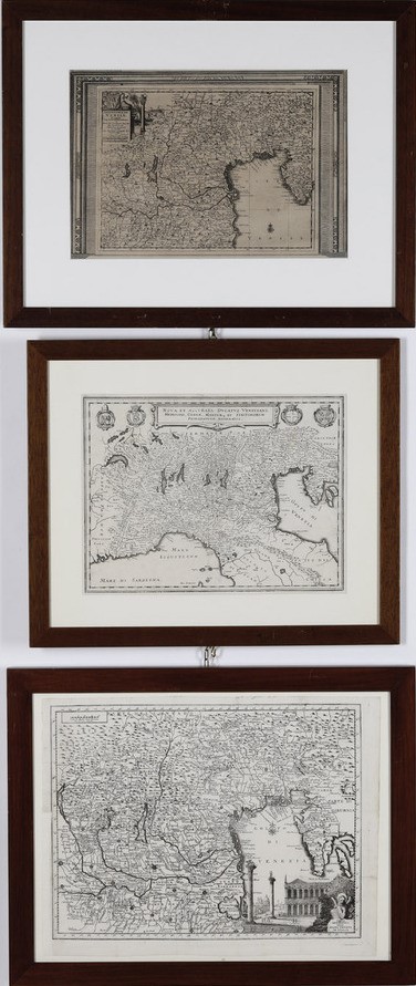 Buon esemplare entro cornice in legno. Si aggiungono nel lotto: Carta geografica dell'stato Veneto in Italia..., sec XVIII e Merian, Nova et accurata ducatus venetiani, mediolani..., 1638, entrambe entro cornice
