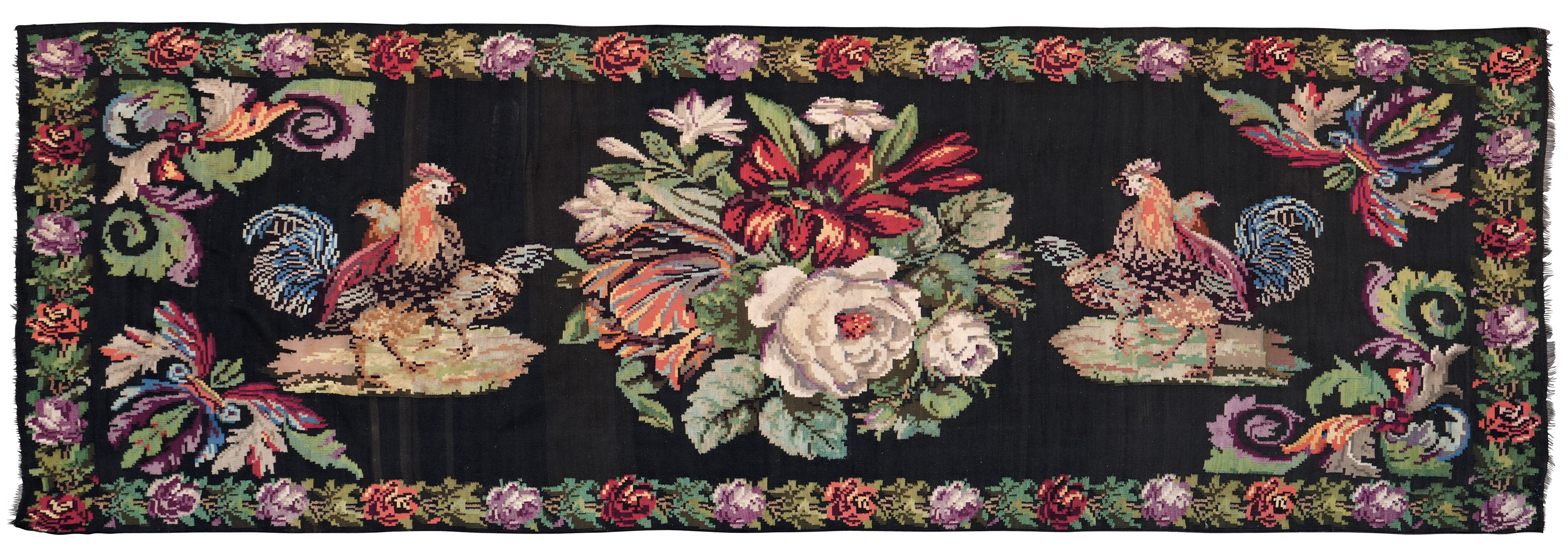 campo marrone/nero con galline e fiori
