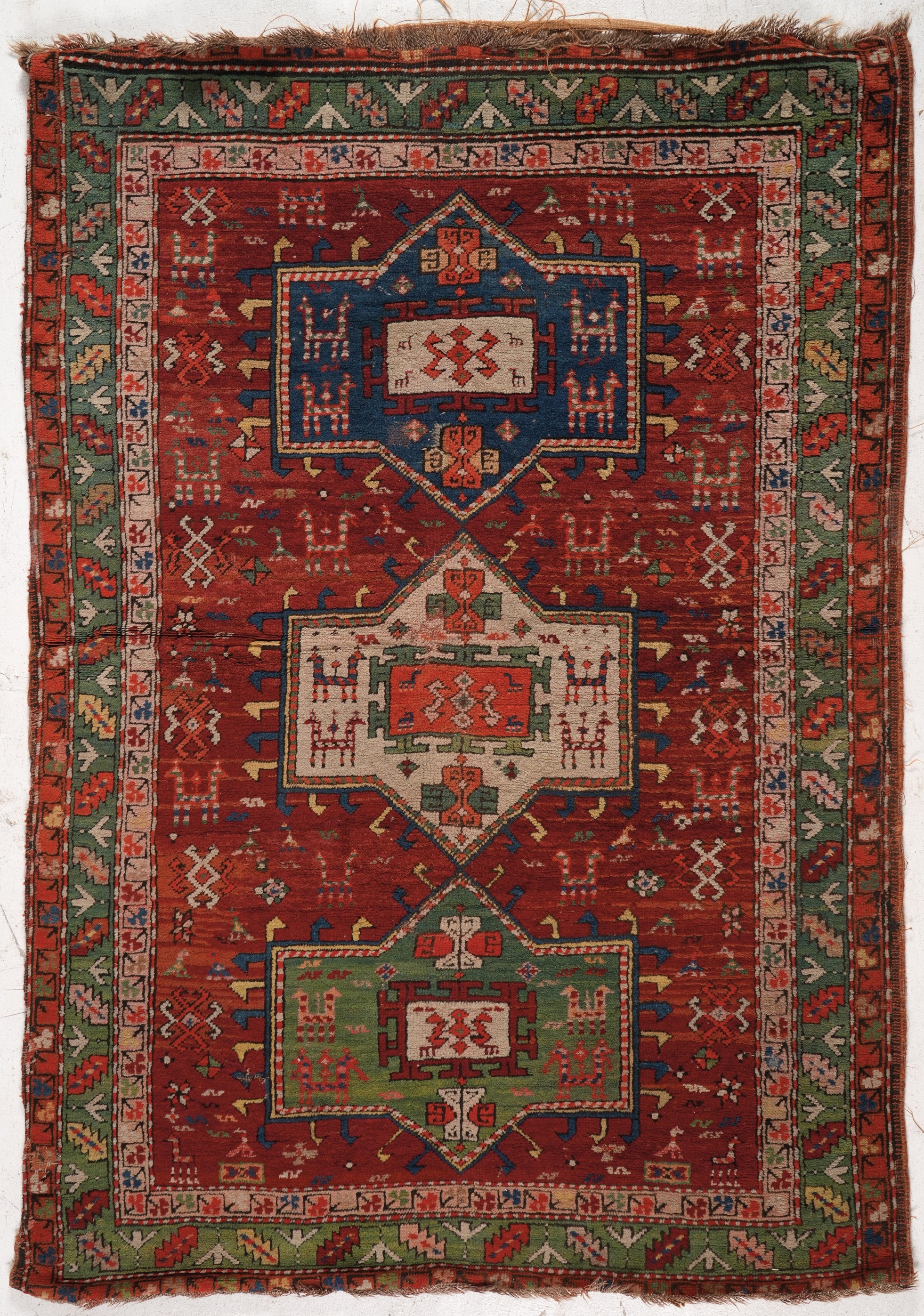 campo roso con tre medaglioni sovrapposti, particolare la bordura di colore verde