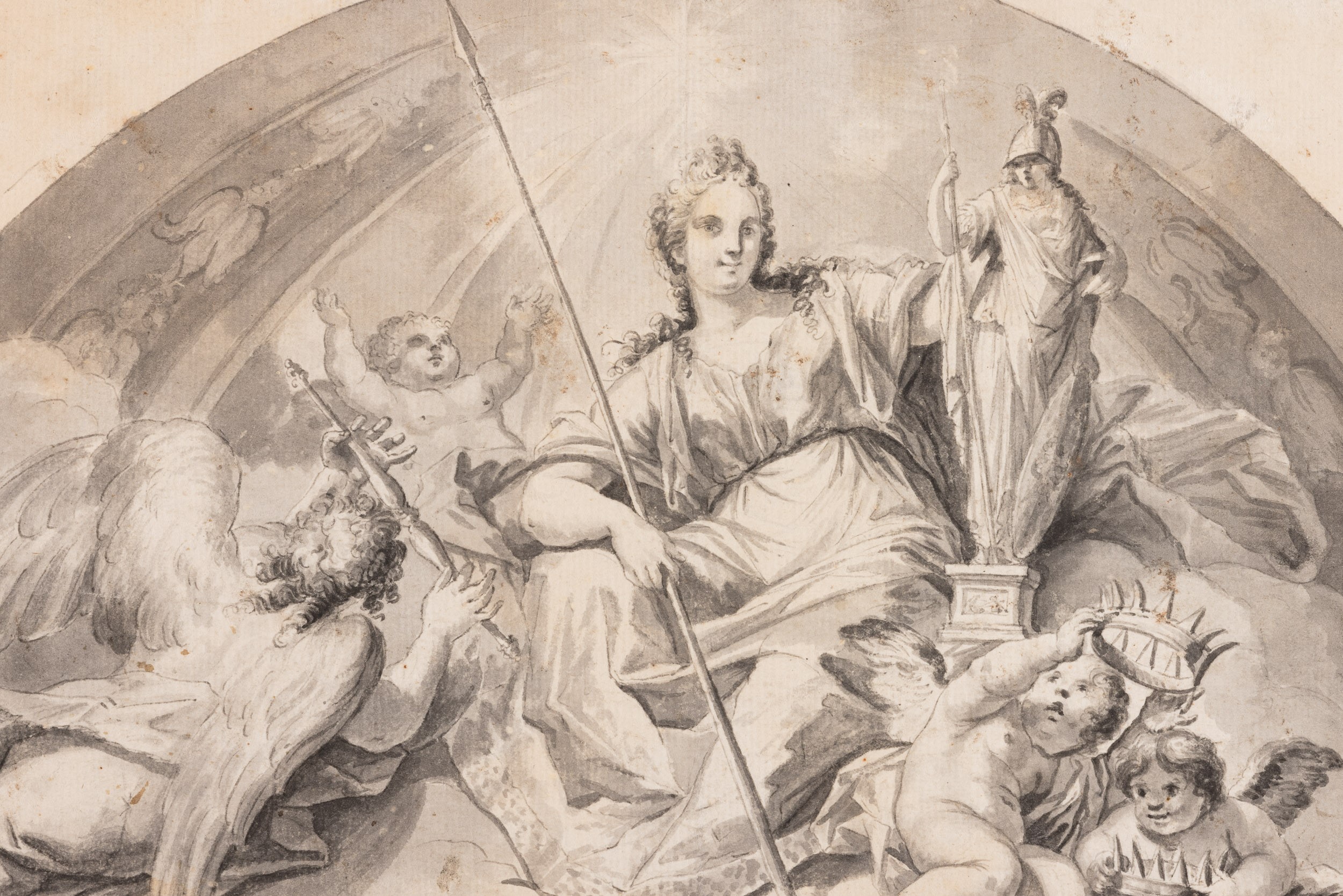 Il disegno qui presentato, per soggetto e composizione, può essere messo a confronto con quello attualmente conservato al Museo Nazionale di San Martino a Napoli. Quest'ultimo, raffigurante l'Allegoria della Architettura, è stato riconosciuto quale studio preparatorio per un particolare della decorazione ad affresco realizzata dal Fischetti per Palazzo Maddaloni di Napoli, a cui l'artista collaborò dopo il 1770.