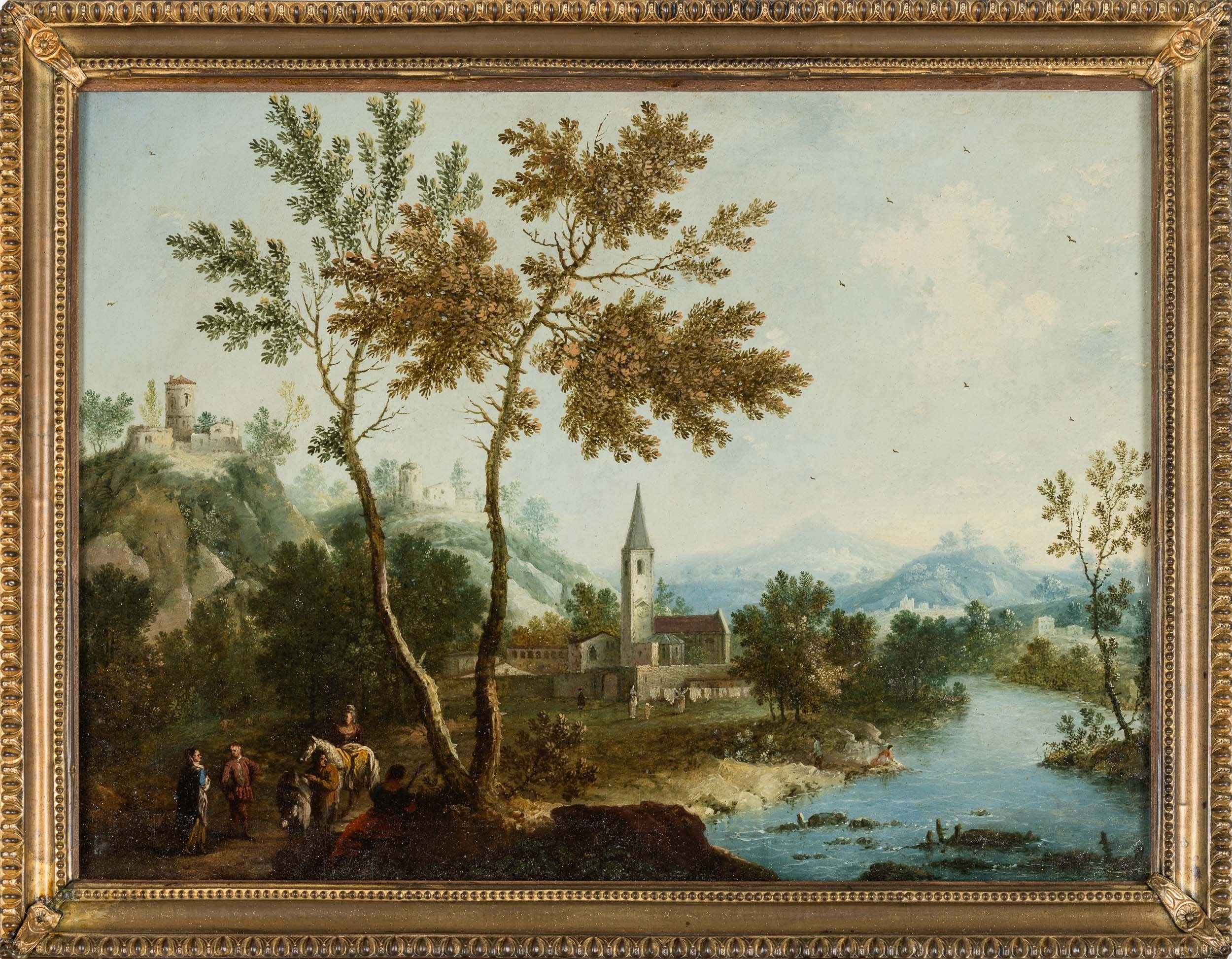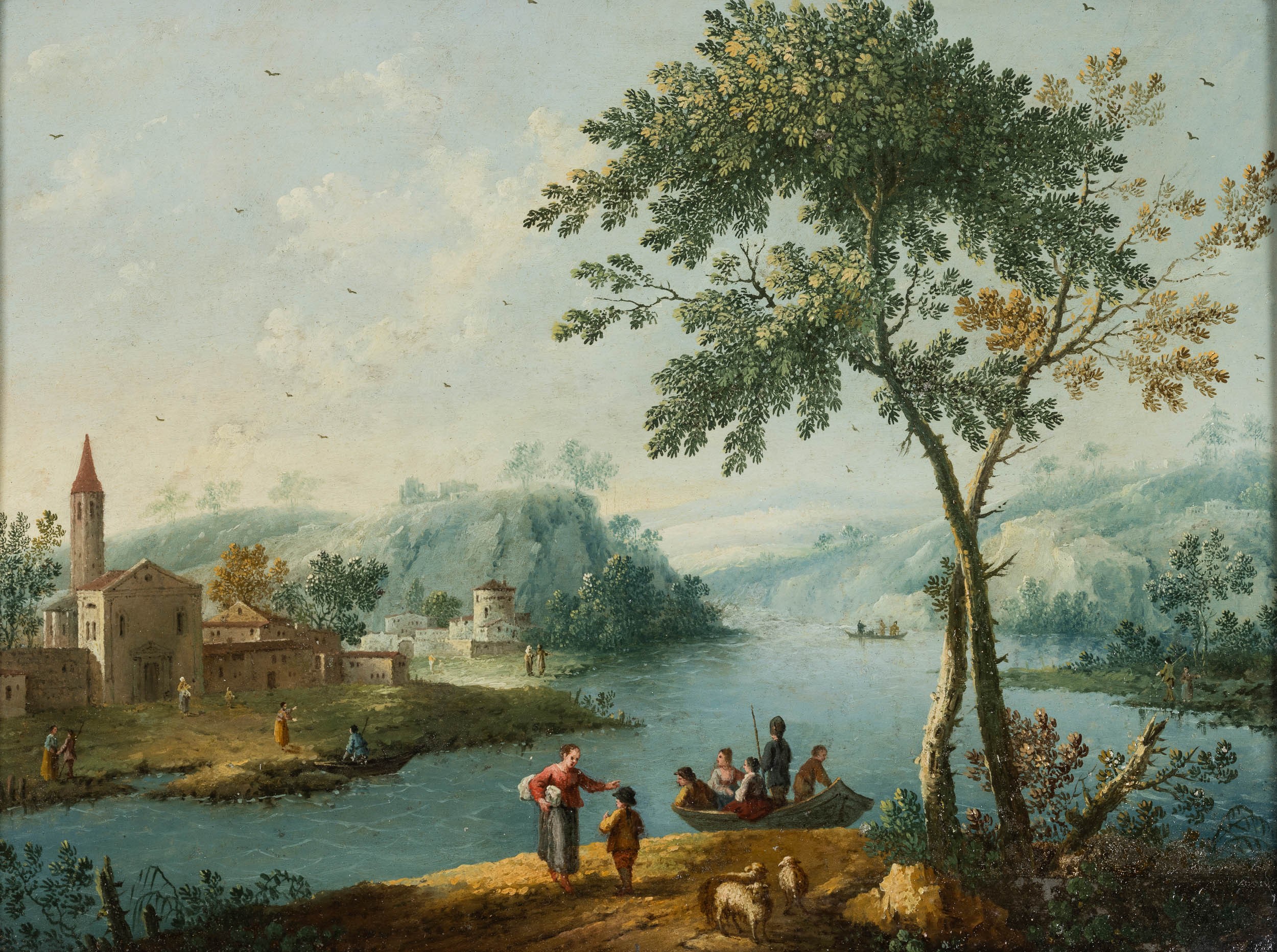 Paesaggi fluviali con figure e villaggi sullo sfondo