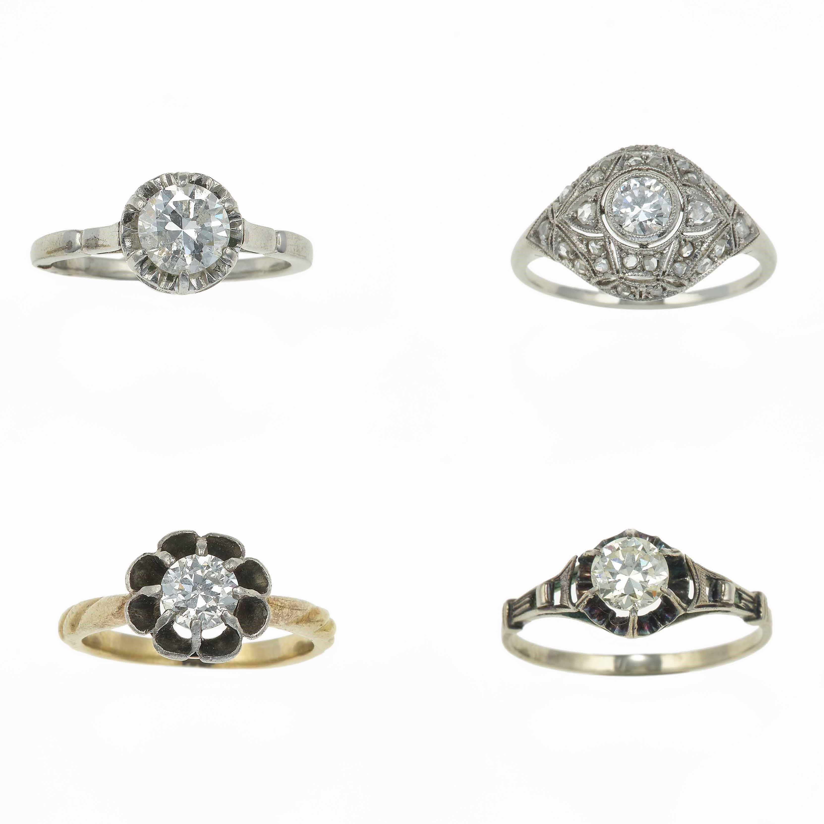 Four diamonds rings. Gold, low karat gold and platinum mounts