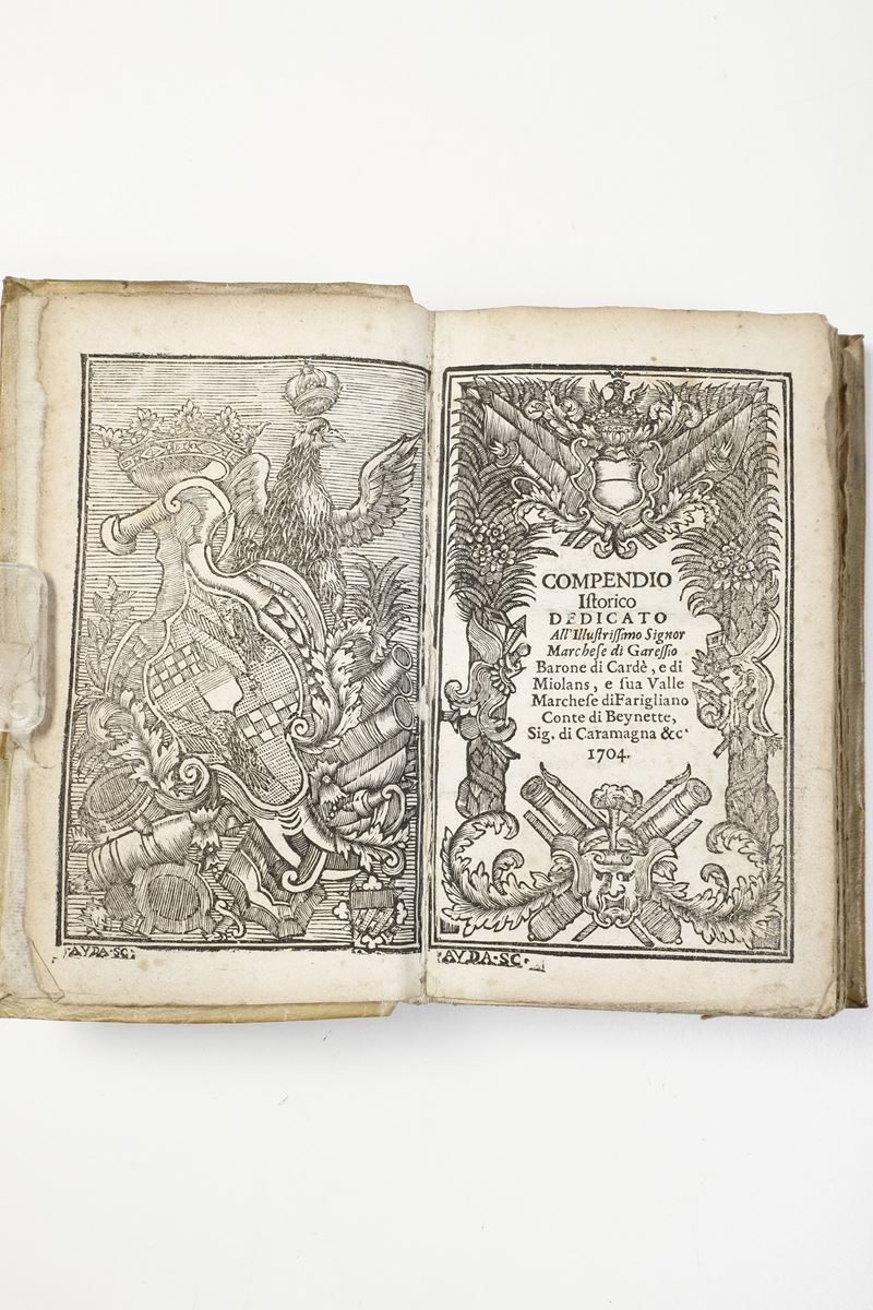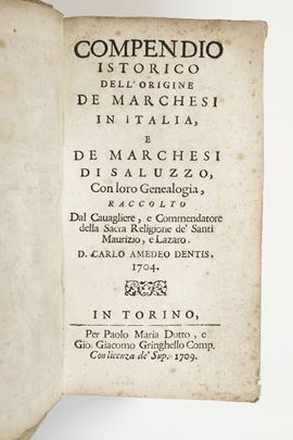 Titoli: 1) Carlo Amedeo Dentis Compendio istorico dell'origine dei marchesi in Italia e dei Marchesi di Saluzzo con loro genealogia...Torino, 1709