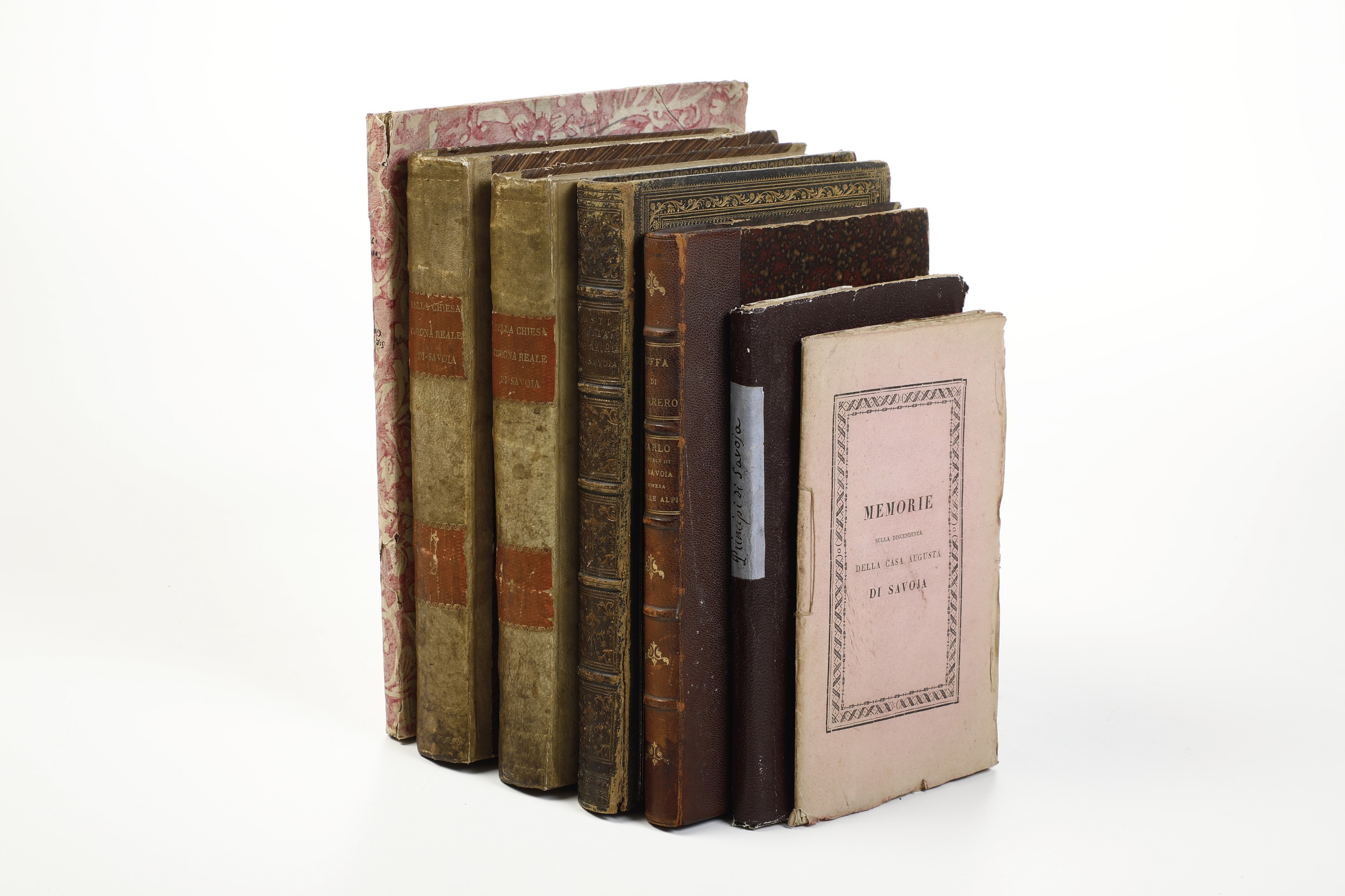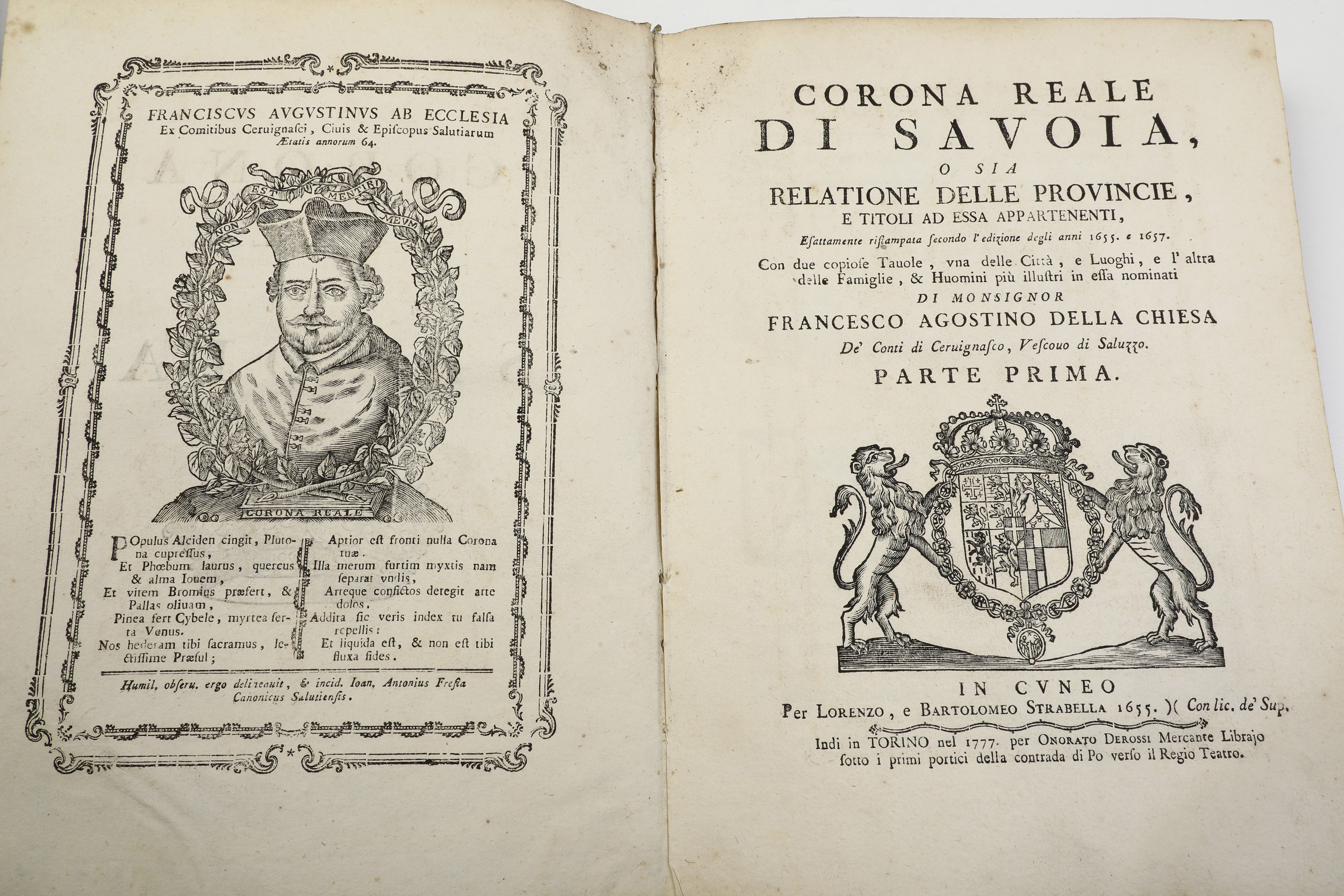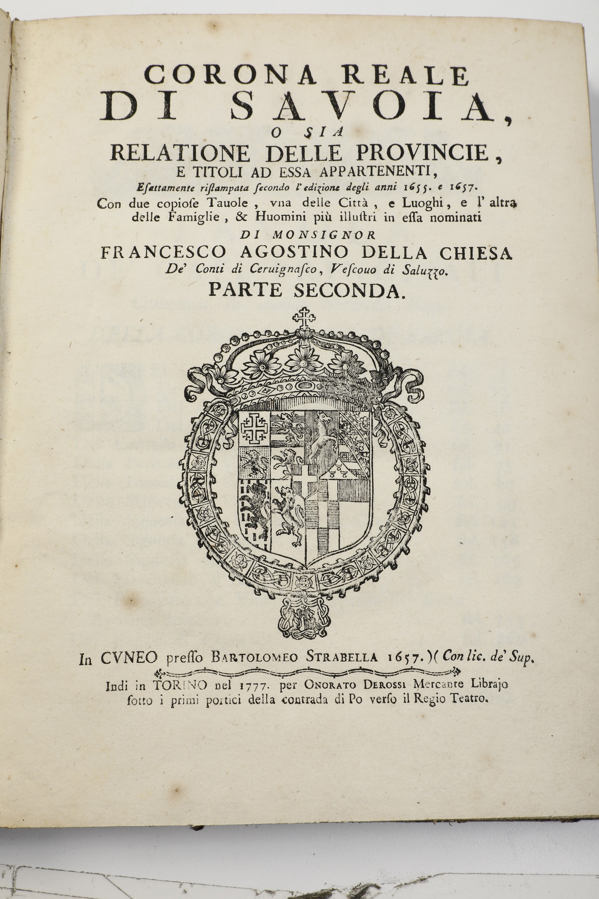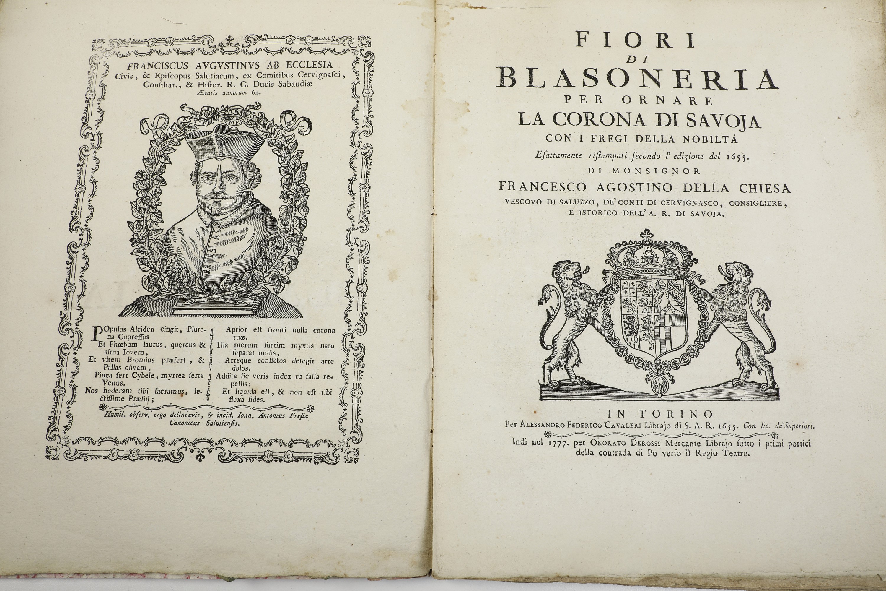 Titoli: 1) Francesco Agostino Della Chiesa Fiori di blasoneria per onorare la corona di Savoja con fregi della nobiltà esattamente ristampati secondo l'edizione del 1655 di monsignor Francesco Agostino Della Chiesa vescovo di Saluzzo, de' conti di Cervignasco, consigliere e istorico dell'A.R. di Savoja