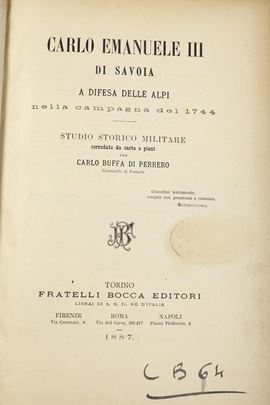 4) Carlo Buffa di Perrero Carlo Emanuele III di Savoia a difesa delle Alpi nella campagna del 1744 Studio storico militare corredato da carte e piani ; Fratelli Bocca Editori Torino 1887