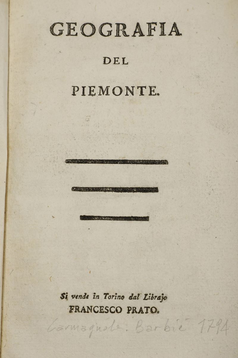 Titoli: 1) Geografia del Piemonte si vende in Torino dal librajo Francesco Prato Pietro Barbiè Carmagnola (1794);