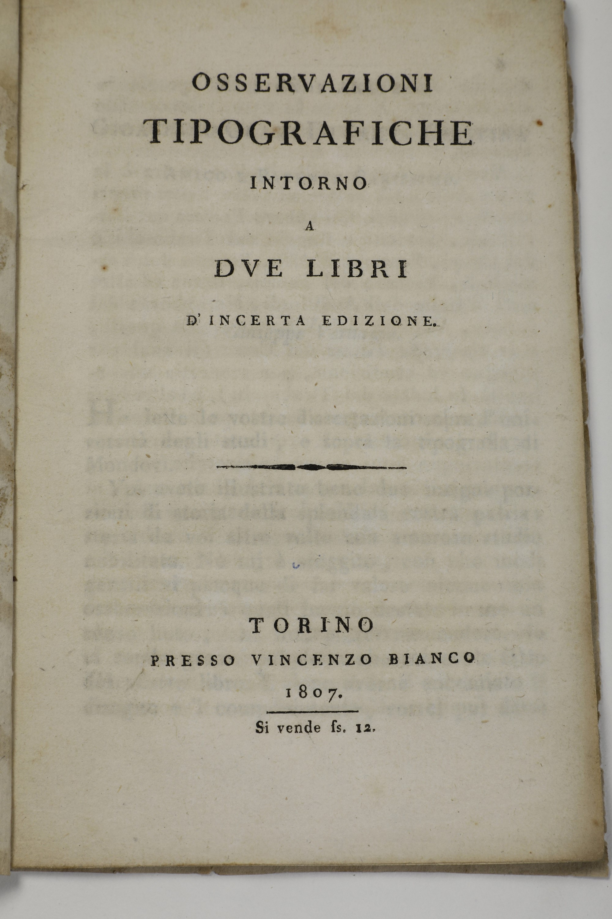 3)Osservazioni tipografiche intorno a due libri d'incerta edizione. Vincenzo Bianco Torino 1807