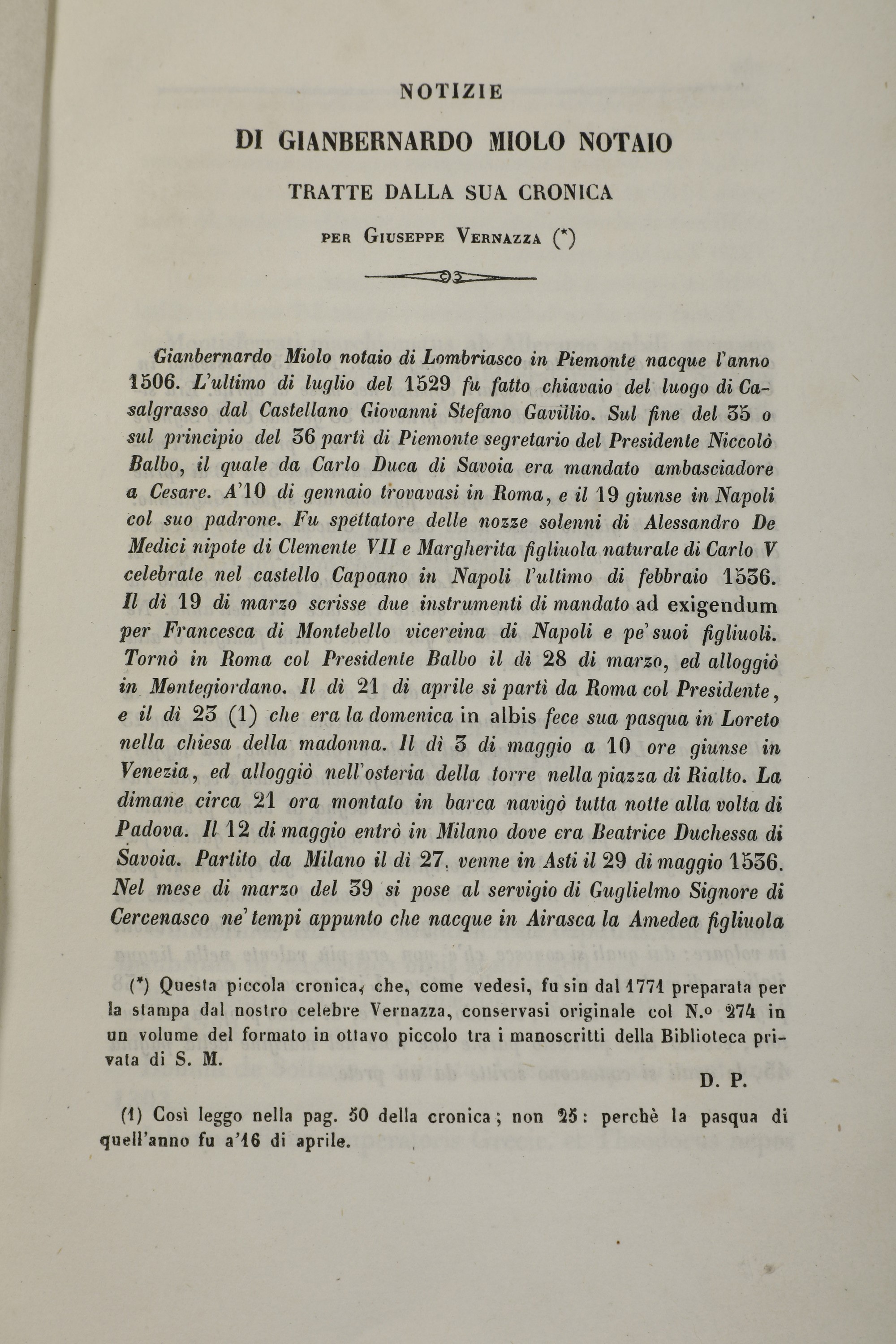 4) Notizie di Gianbernardo Miolo notaio tratte dalla sua cronica in “Miscellanea di storia ital. I, 147-148” Torino 1862;