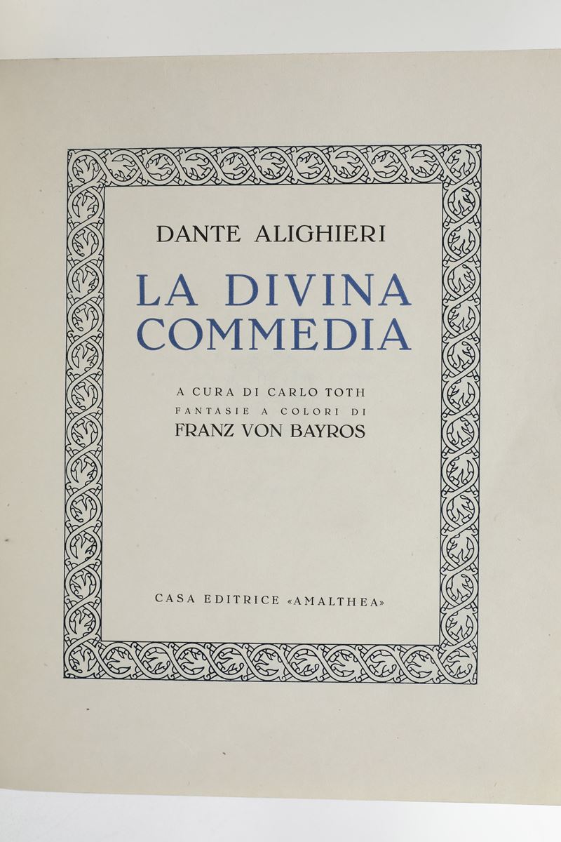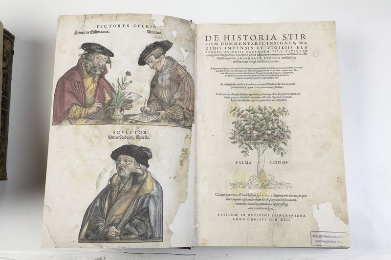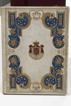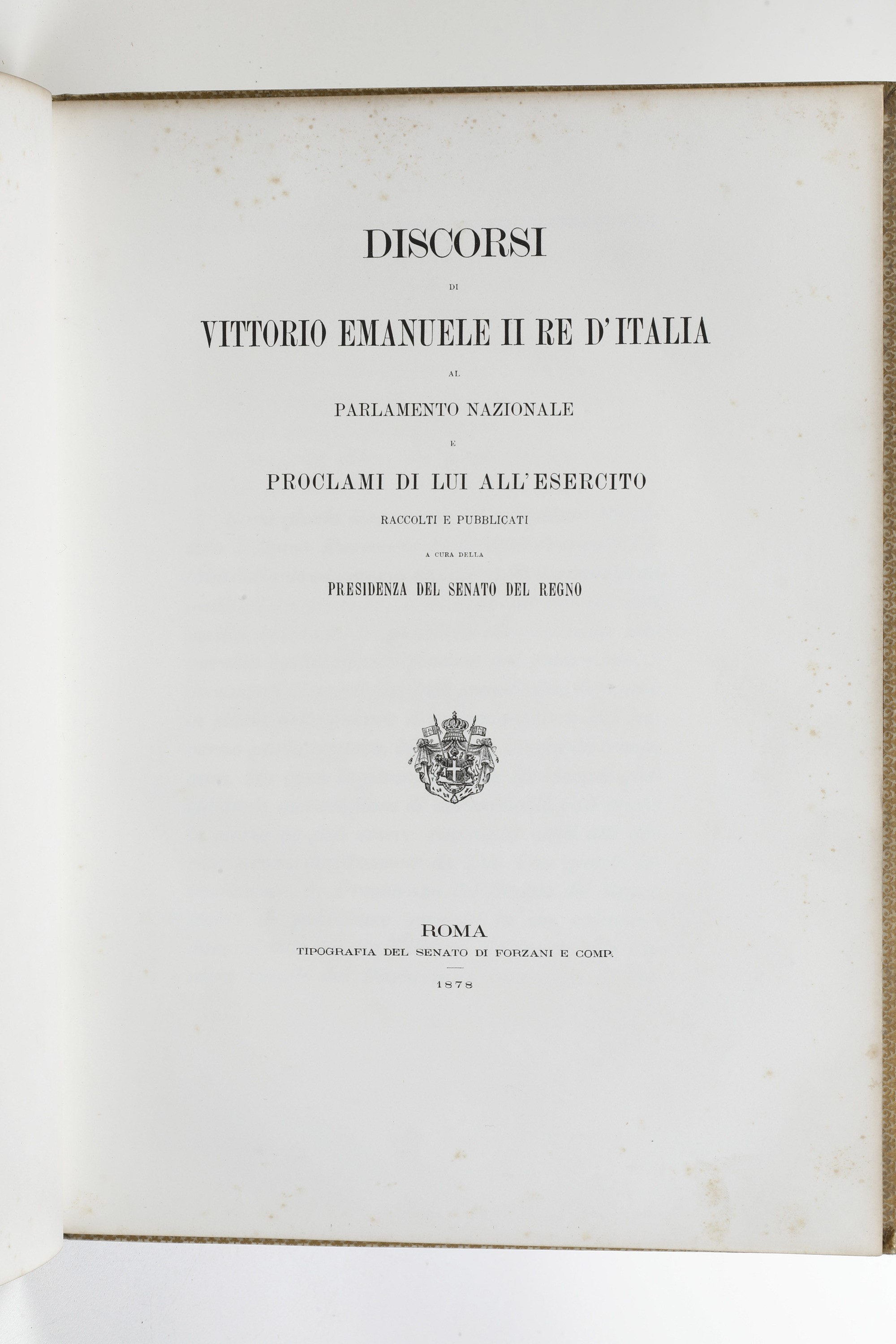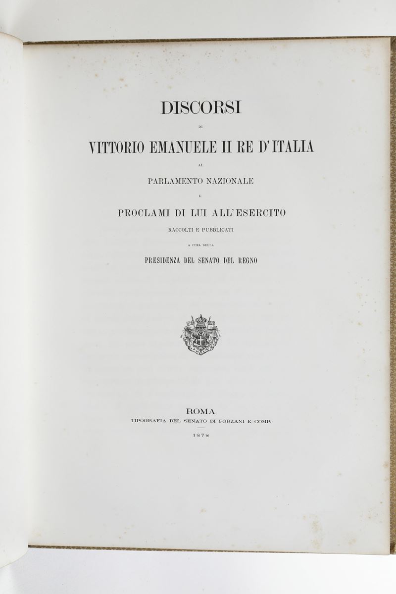 In-4°. Bella rilegatura coeva con ricchi fregi in oro e impressioni a secco (abrasioni e rotture a un piatto). Si uniscono nel lotto: Discorsi e proclami di Vittorio Emanuele II, Roma, Tipografia del senato, 1868 (bella rilegatura policroma con armi de casa Savoia); Dante Alighieri, La Divina Commedia, illustrata a colori da Franz Von Bayros... Amalthea, Zurigo, Lispia, Vienna, 1921. Esemplare appartenente alla tiratura di 250 esemplari con testo in italiano soltanto. Bella edizione celebrativa pubblicata nel sesto centenario della morte del poeta; De Historia Stirpium Commentari Insignes...edizione anastatica di un esemplare con tavole a colori del XVI secolo