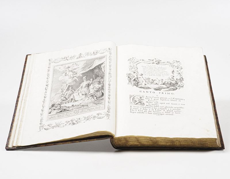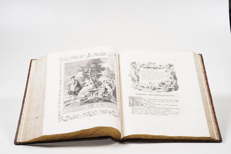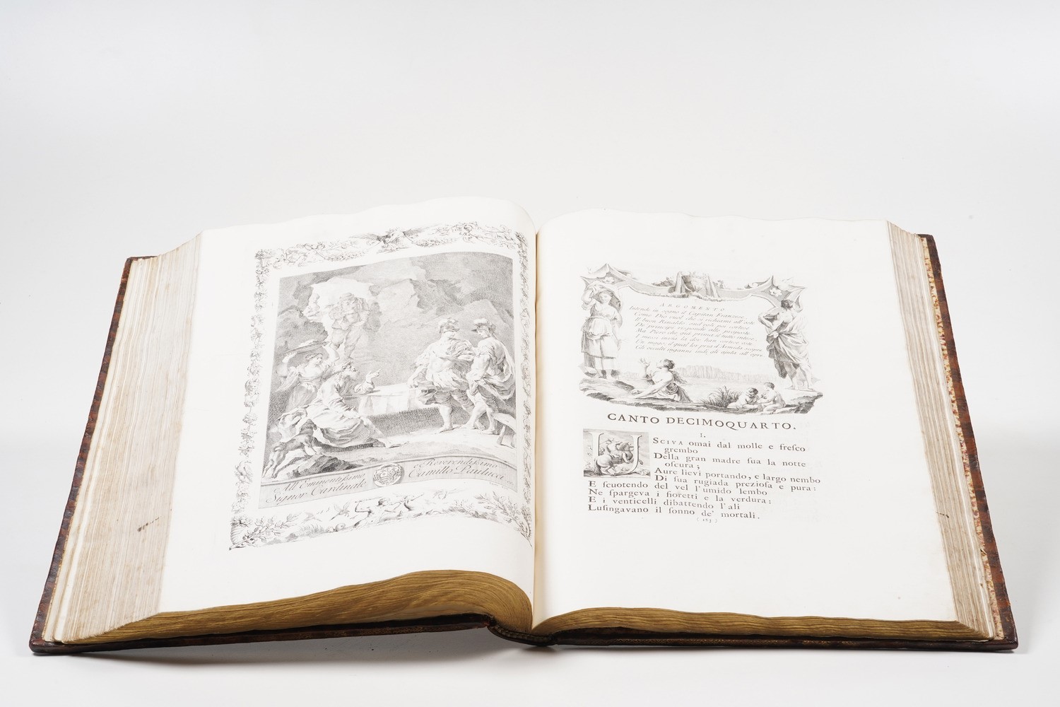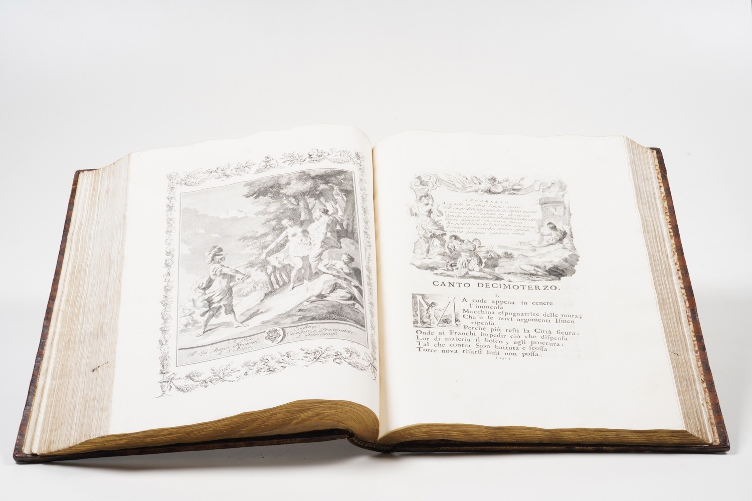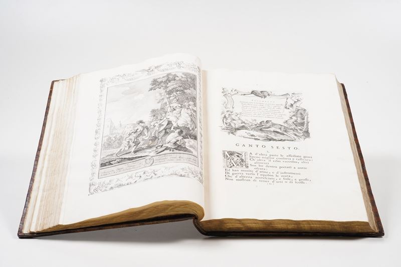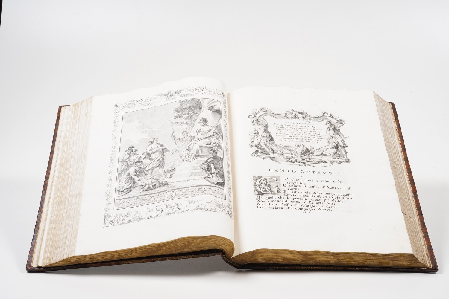 In-folio. Bellissima rilegatura coeva in piena pelle (piccoli restauri e abrasioni). Ricchi fregi in oro ai piatti e al dorso, che presenta anche un tassello con il titolo in oro. Tagli decorati in oro. Il tutto conservato entro cofanetto moderno. Magnifica edizione, considerata da molti un capolavoro tra i libri figurati veneziani del secolo XVIII. Oltre alla bella antiporta allegorica figurata, e al ritratto dell'imperatrice Maria Teresa d'Austria sono presenti 20 tavole, magistralmente incise in rame da Giovan Battista Piazzetta. Sono presenti, inoltre, sempre per opera del Piazzetta, numerose testatine e finalini e capilettera incisi in rame. Bellissimo esemplare fresco e marginoso. Si deve registrare tuttavia la presenza, per buona parte del volume di alcune macchie di umidità e piccole muffe, che secondo il nostro parere possono essere facilmente trattate a tampone da un restauratore professionale.