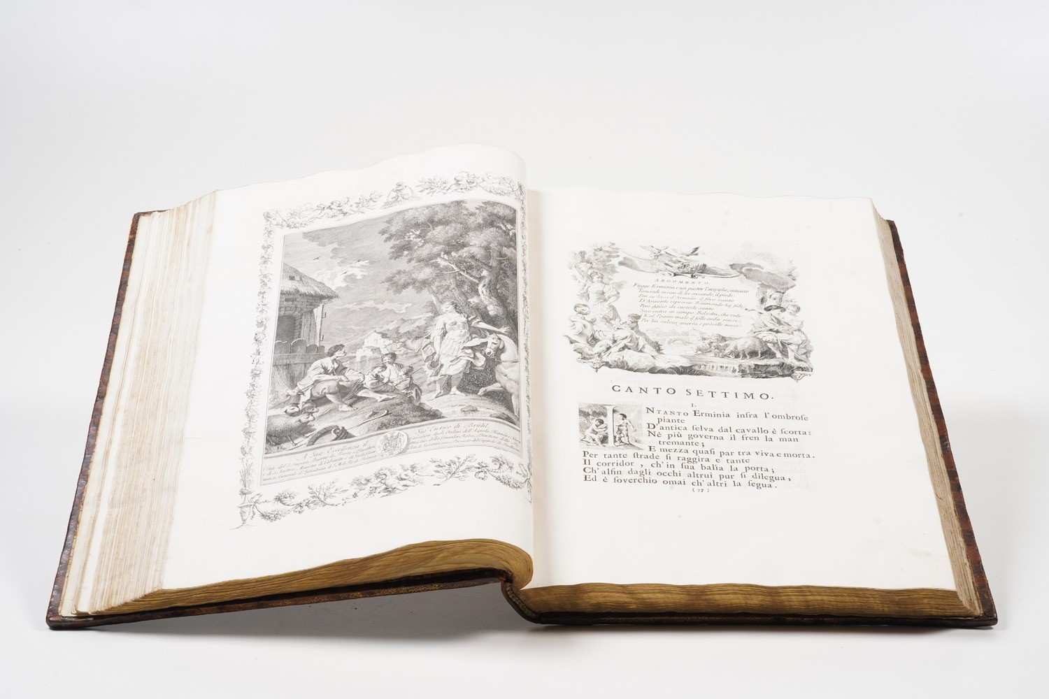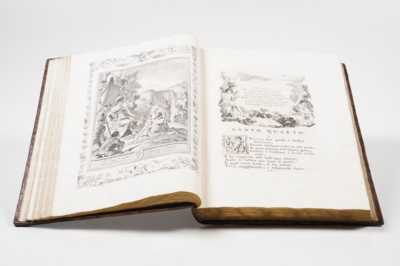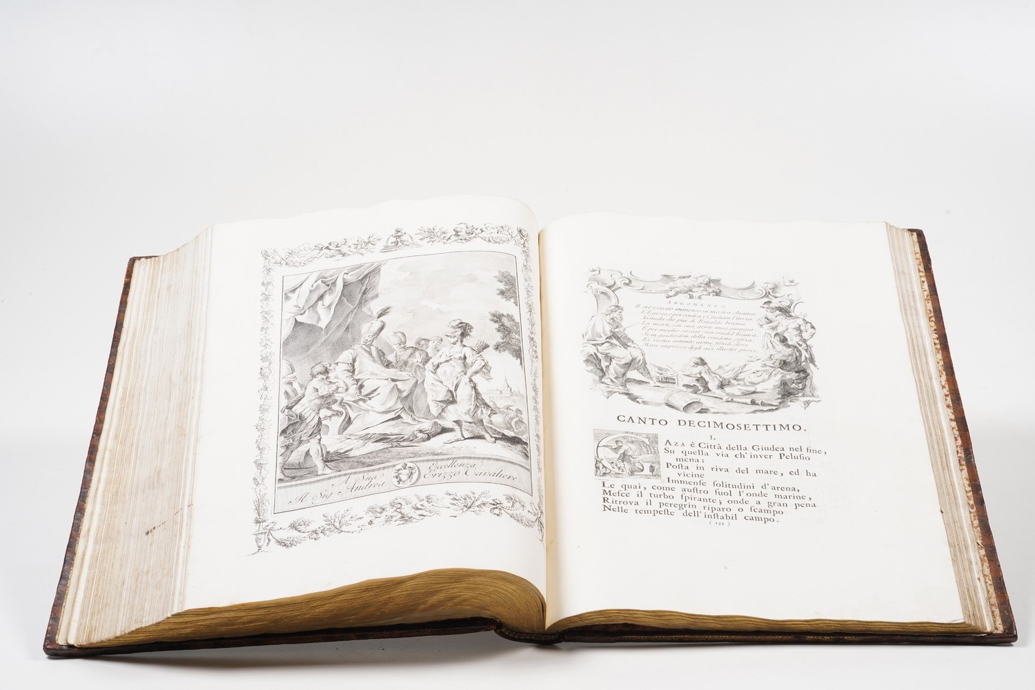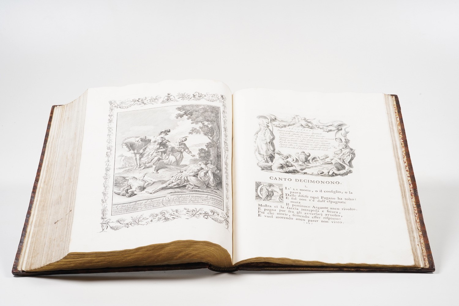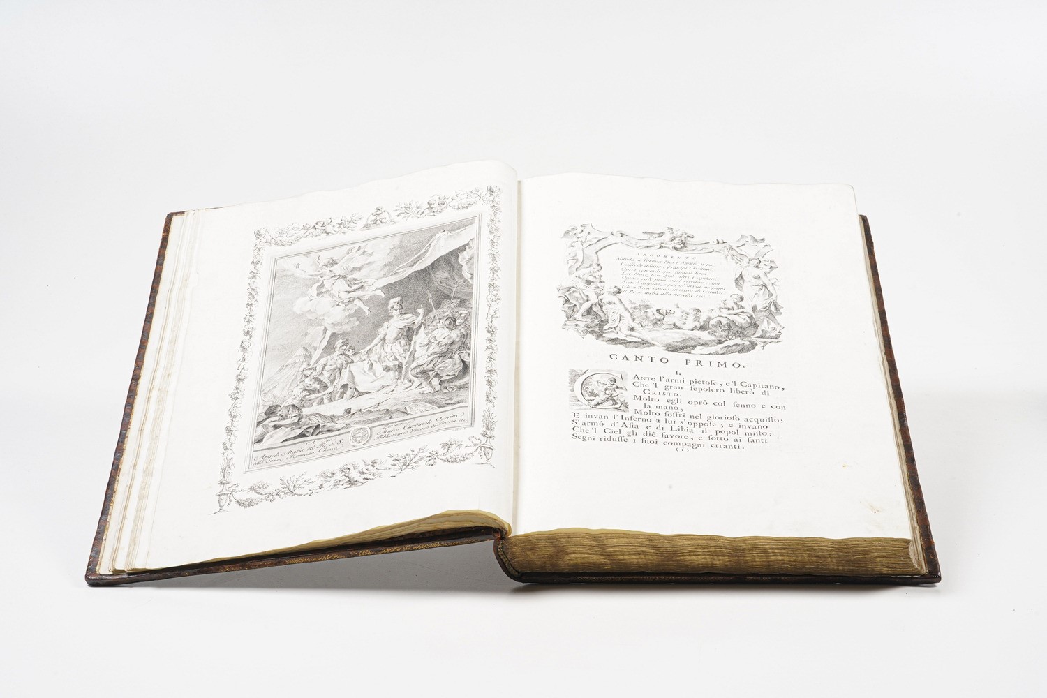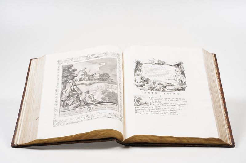In-folio. Bellissima rilegatura coeva in piena pelle (piccoli restauri e abrasioni). Ricchi fregi in oro ai piatti e al dorso, che presenta anche un tassello con il titolo in oro. Tagli decorati in oro. Il tutto conservato entro cofanetto moderno. Magnifica edizione, considerata da molti un capolavoro tra i libri figurati veneziani del secolo XVIII. Oltre alla bella antiporta allegorica figurata, e al ritratto dell'imperatrice Maria Teresa d'Austria sono presenti 20 tavole, magistralmente incise in rame da Giovan Battista Piazzetta. Sono presenti, inoltre, sempre per opera del Piazzetta, numerose testatine e finalini e capilettera incisi in rame. Bellissimo esemplare fresco e marginoso. Si deve registrare tuttavia la presenza, per buona parte del volume di alcune macchie di umidità e piccole muffe, che secondo il nostro parere possono essere facilmente trattate a tampone da un restauratore professionale.