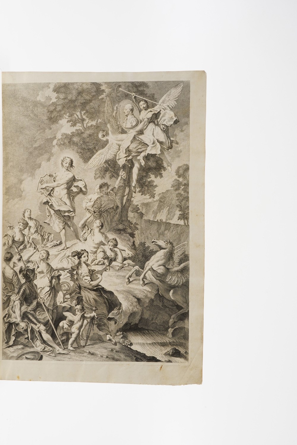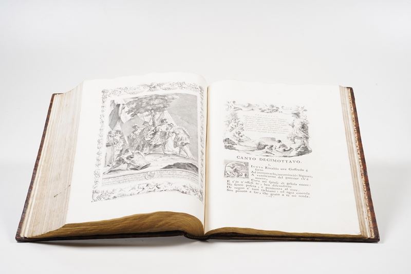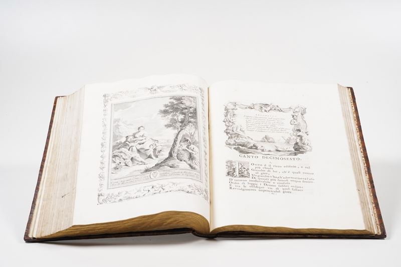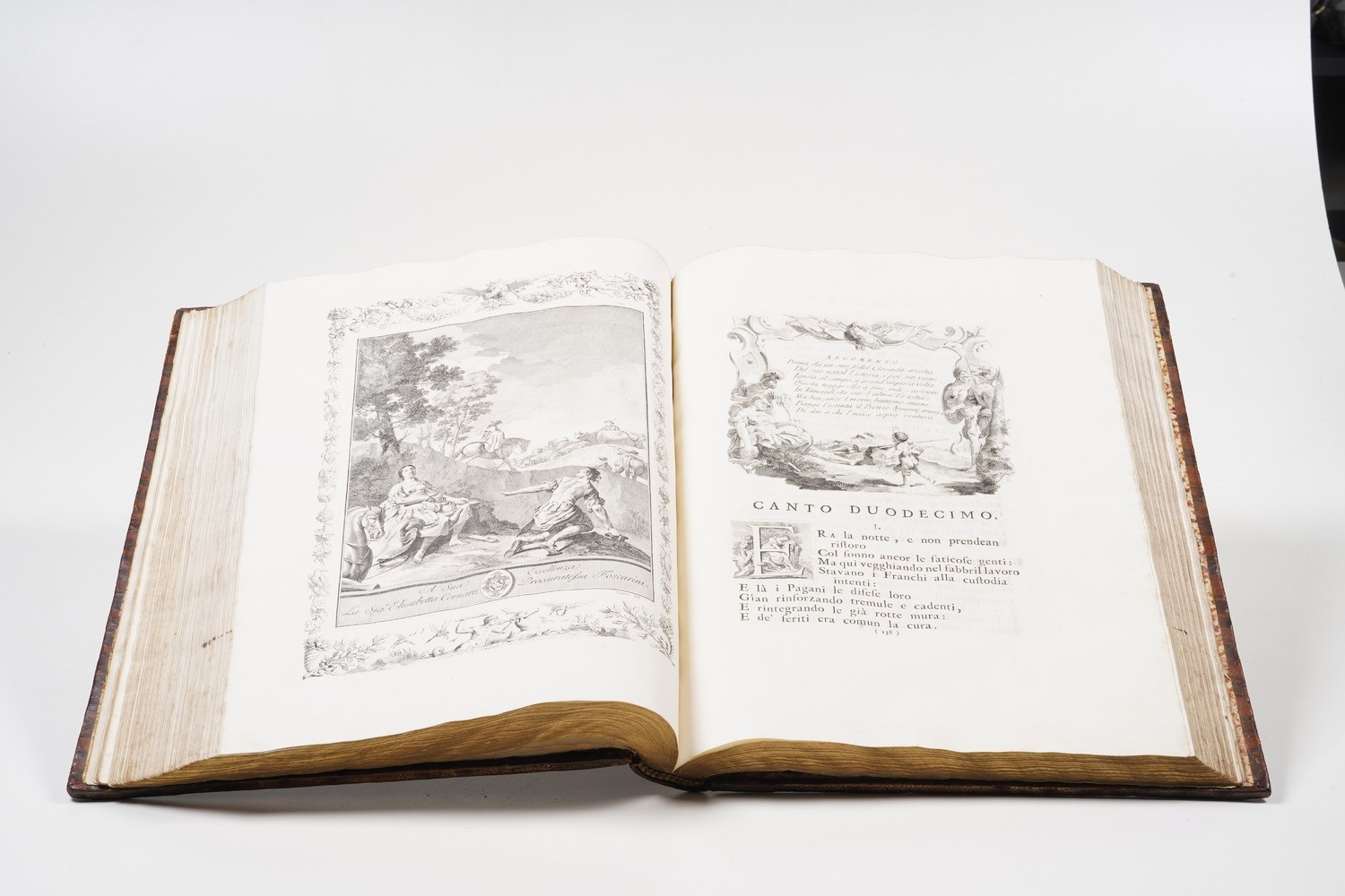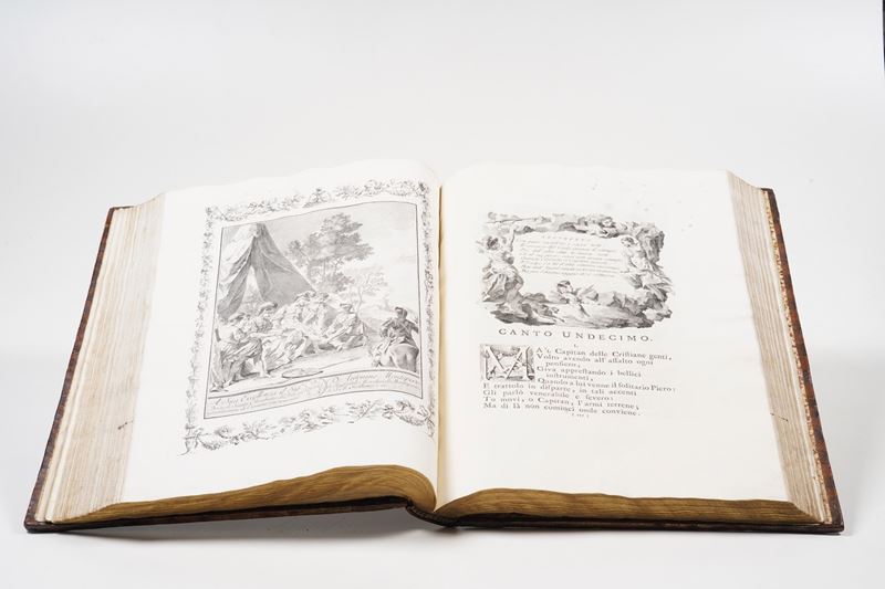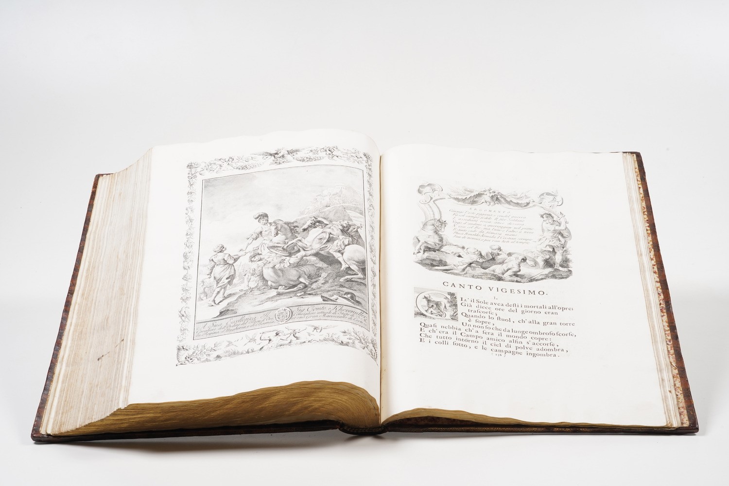 In-folio. Bellissima rilegatura coeva in piena pelle (piccoli restauri e abrasioni). Ricchi fregi in oro ai piatti e al dorso, che presenta anche un tassello con il titolo in oro. Tagli decorati in oro. Il tutto conservato entro cofanetto moderno. Magnifica edizione, considerata da molti un capolavoro tra i libri figurati veneziani del secolo XVIII. Oltre alla bella antiporta allegorica figurata, e al ritratto dell'imperatrice Maria Teresa d'Austria sono presenti 20 tavole, magistralmente incise in rame da Giovan Battista Piazzetta. Sono presenti, inoltre, sempre per opera del Piazzetta, numerose testatine e finalini e capilettera incisi in rame. Bellissimo esemplare fresco e marginoso. Si deve registrare tuttavia la presenza, per buona parte del volume di alcune macchie di umidità e piccole muffe, che secondo il nostro parere possono essere facilmente trattate a tampone da un restauratore professionale.