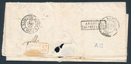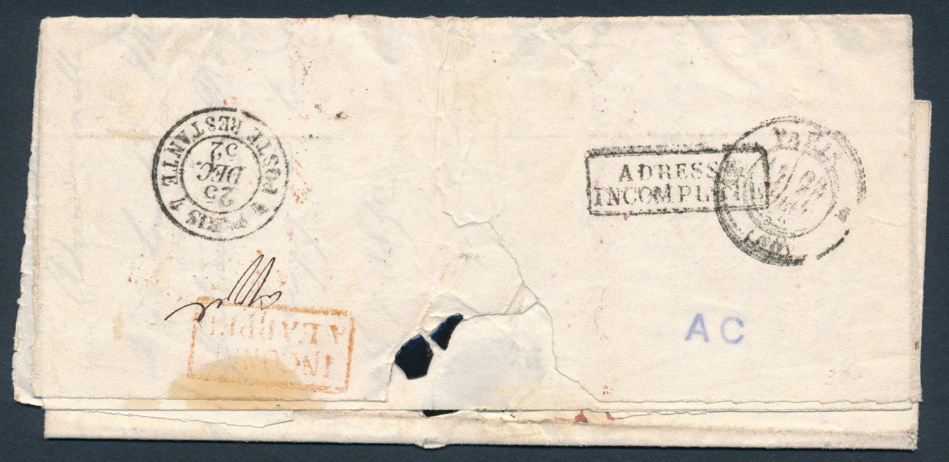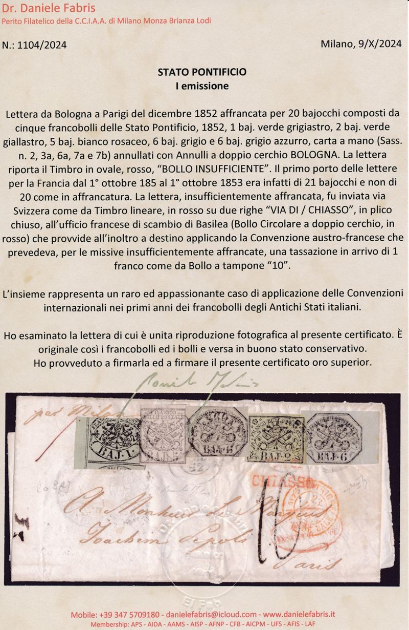 La lettera riporta il Timbro in ovale, rosso, “BOLLO INSUFFICIENTE”. Il primo porto delle lettere per la Francia dal 1° ottobre 185 al 1° ottobre 1853 era infatti di 21 bajocchi e non di 20 come in affrancatura. La lettera, insufficientemente affrancata, fu inviata via Svizzera come da Timbro lineare, in rosso su due righe “VIA DI / CHIASSO”, in plico chiuso, all’ufficio francese di scambio di Basilea (Bollo Circolare a doppio cerchio, in rosso) che provvide all’inoltro a destino applicando la Convenzione austro-francese che prevedeva, per le missive insufficientemente affrancate, una tassazione in arrivo di 1 franco come da Bollo a tampone “10” - L’insieme rappresenta un raro ed appassionante caso di applicazione delle Convenzioni internazionali nei primi anni dei francobolli degli Antichi Stati italiani - Cert. Avanzo e Fabris