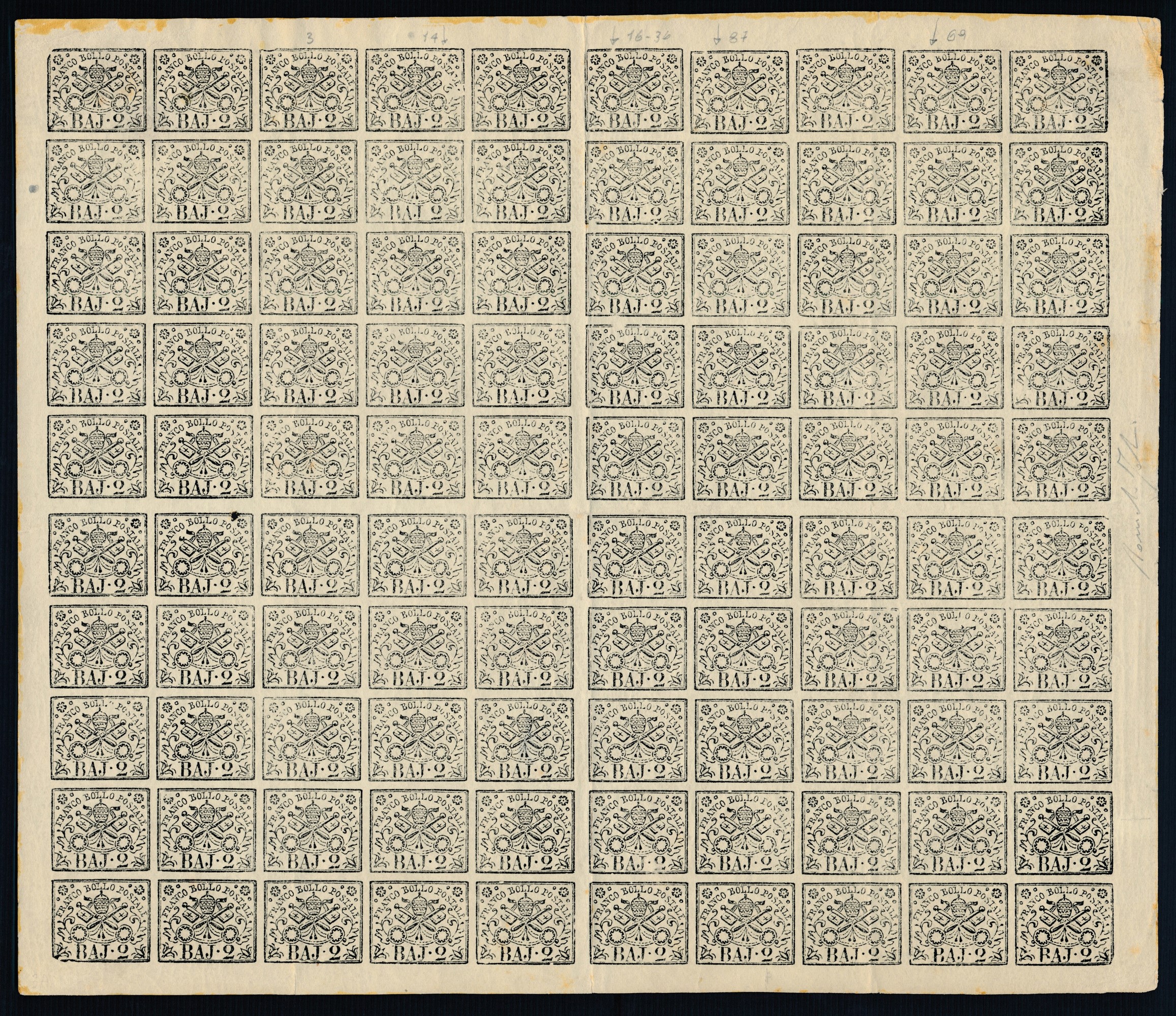 1852 - Stato Pontificio - I tipo - “Stemma pontificio” - 2 bajocchi bianco - Foglio di 100 esemplari (sass. 3A, 3Ae [A, [..]