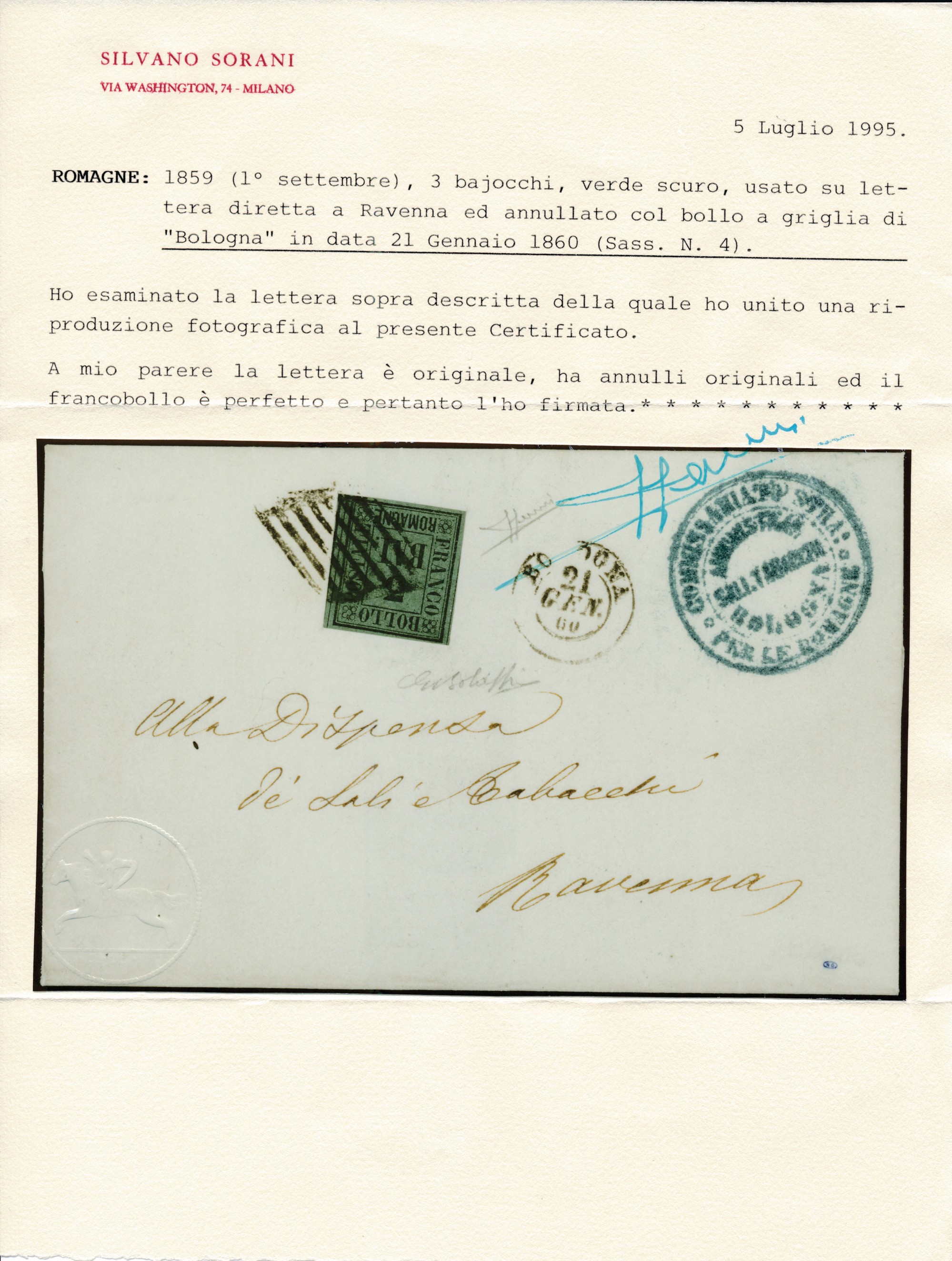 1859 – Romagne – Lettera da Bologna a Ravenna affrancata con 3 bajocchi verde scuro (Sass. 4) con annullo a griglia.