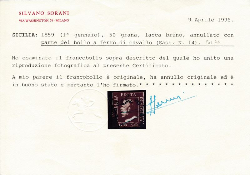 1859 - Sicilia - 50 grana lacca bruno (Sass. 14) annullato con parte di ferro di cavallo