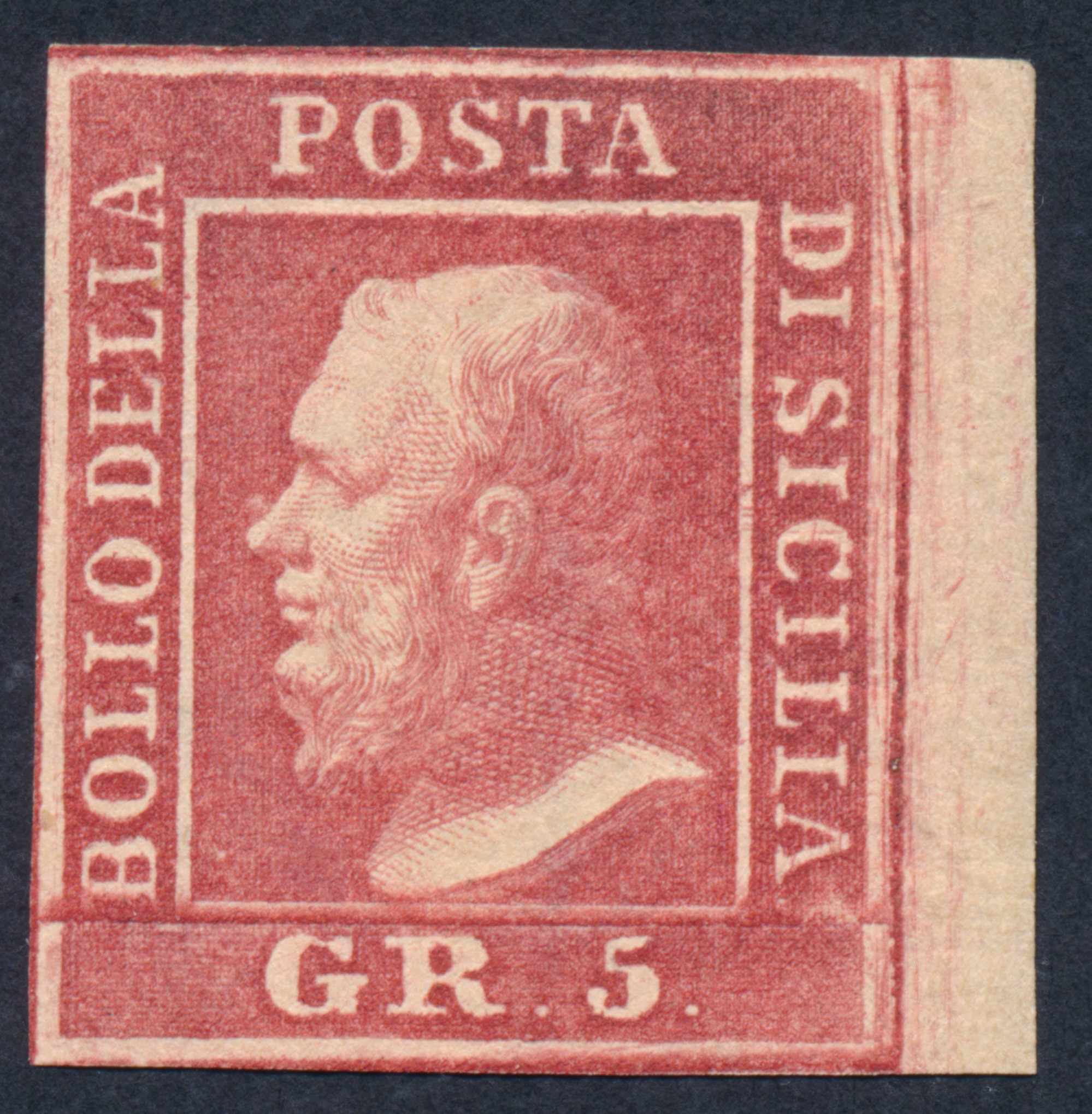 1859 - Sicilia - Effigie di Ferdinando II - Carta a macchina di Napoli - Stampa calcografica in fogli di 100 esemplari - Non dentellato. 5 grana rosa vermiglio bdf (Sass. 9e) gomma originale - Posizione 30.