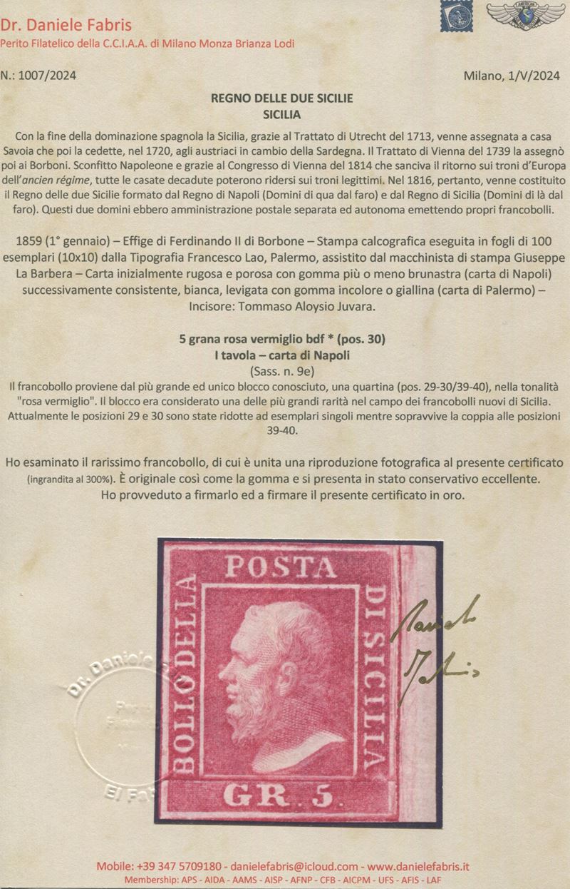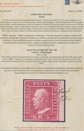 Francobollo in stato di conservazione eccellente e proviente dal più grande ed unico blocco conosciuto, una quartina (pos. 29-30/39-40), nella tonalità "rosa vermiglio", blocco considerato una delle più grandi rarità nel campo dei francobolli nuovi di Sicilia - Grande rarità - A.Diena, Cert. Fabris