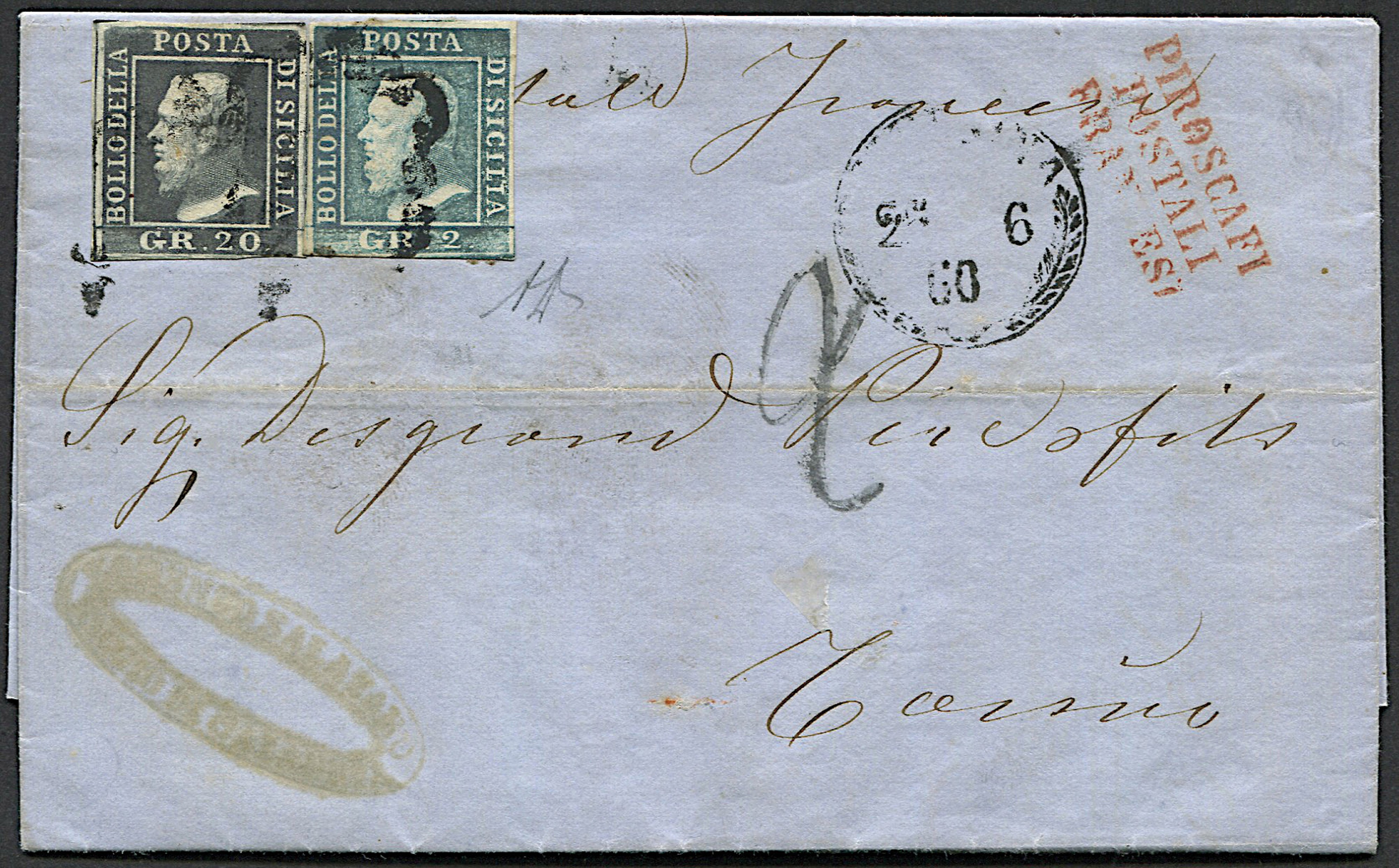 Affrancata in tariffa di un foglio per 22 grana con 2 grana azzurro III tav. carta di Pa. e 20 grana grigio ardesia carta di Napoli (S. 8, 13). Tassa in arrivo di 20 centesimi per la tratta Genova/Torino, viaggiata col vapore francese “Quirinal”, bollo di transito al verso di Genova del 29 e di arrivo a Torino del giorno stesso. Francobolli in buono stato.