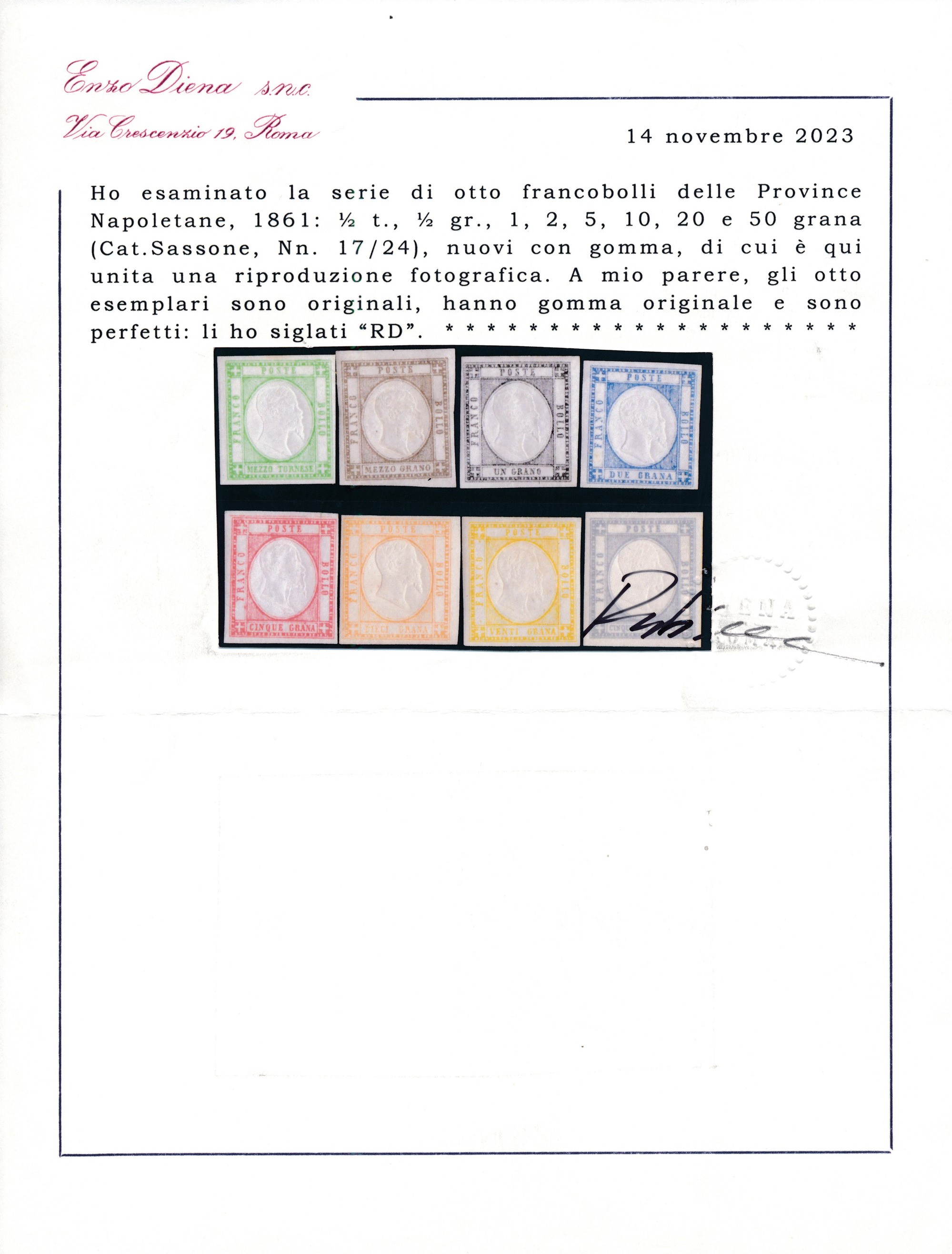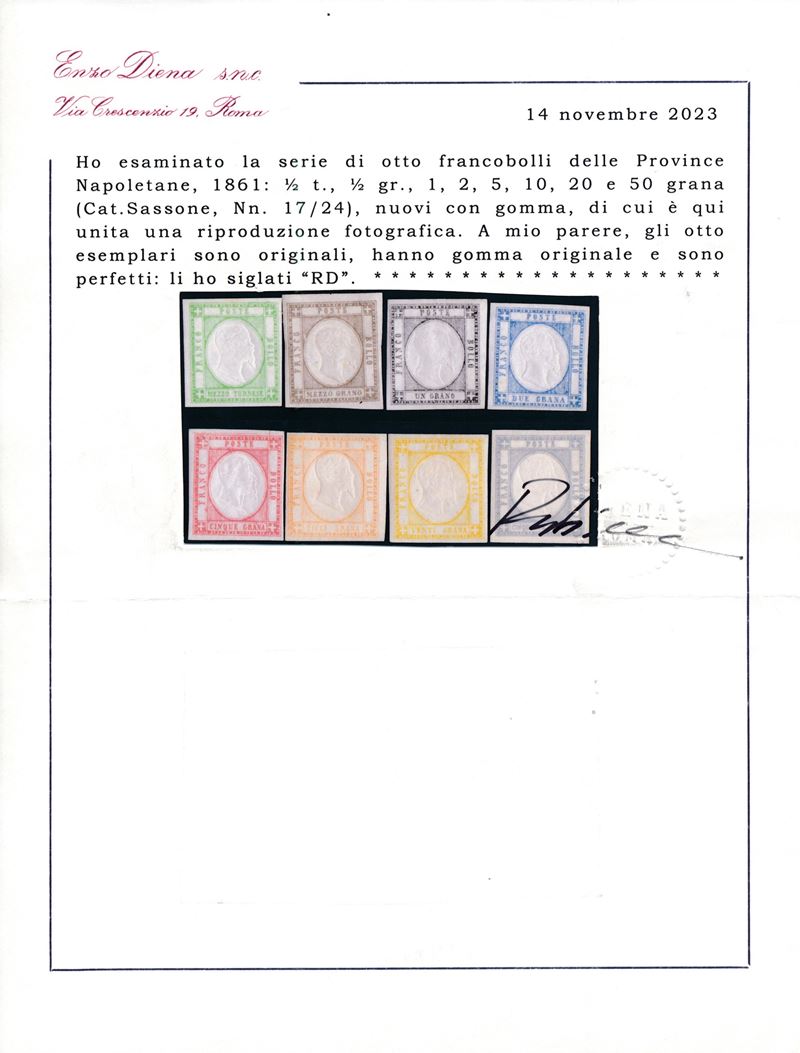 1861 – Napoli – Province napoletane – Serie completa di otto francobolli (Sass. 17/24) con gomma originale.