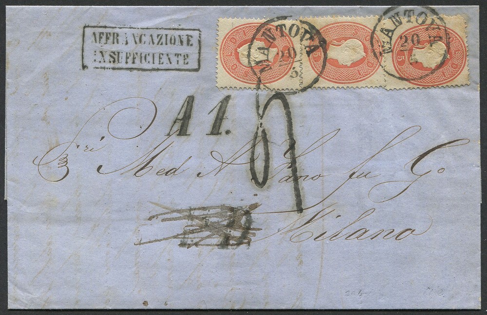 Affrancata con tre esemplari del 5 soldi della 3a emissione, tassata integralmente per 40 cents. Bollo “Affrancazione Insufficiente” in cartella, bollo “P.D.” cancellato a penna e “A1”. Al verso bollo di arrivo del 21 maggio. Molto bella, raro documento di storia postale.