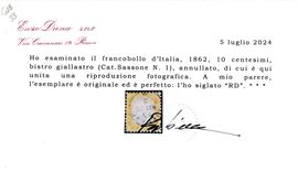 1862 – Regno d’Italia – 10 cent. bistro giallastro usato (Sass. 1).