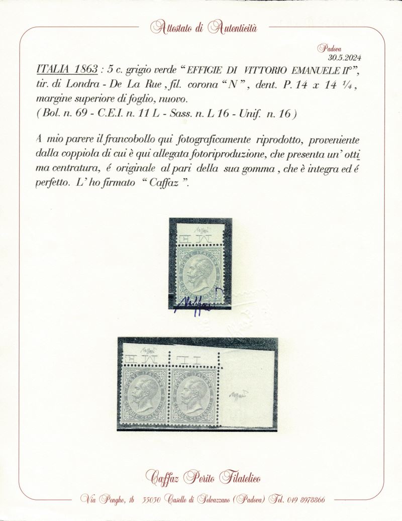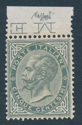 1863 – Regno d’Italia – 5 cent. grigio verde, De La Rue, Tiratura di Londra, gomma integra, bdf (Sass. L16).