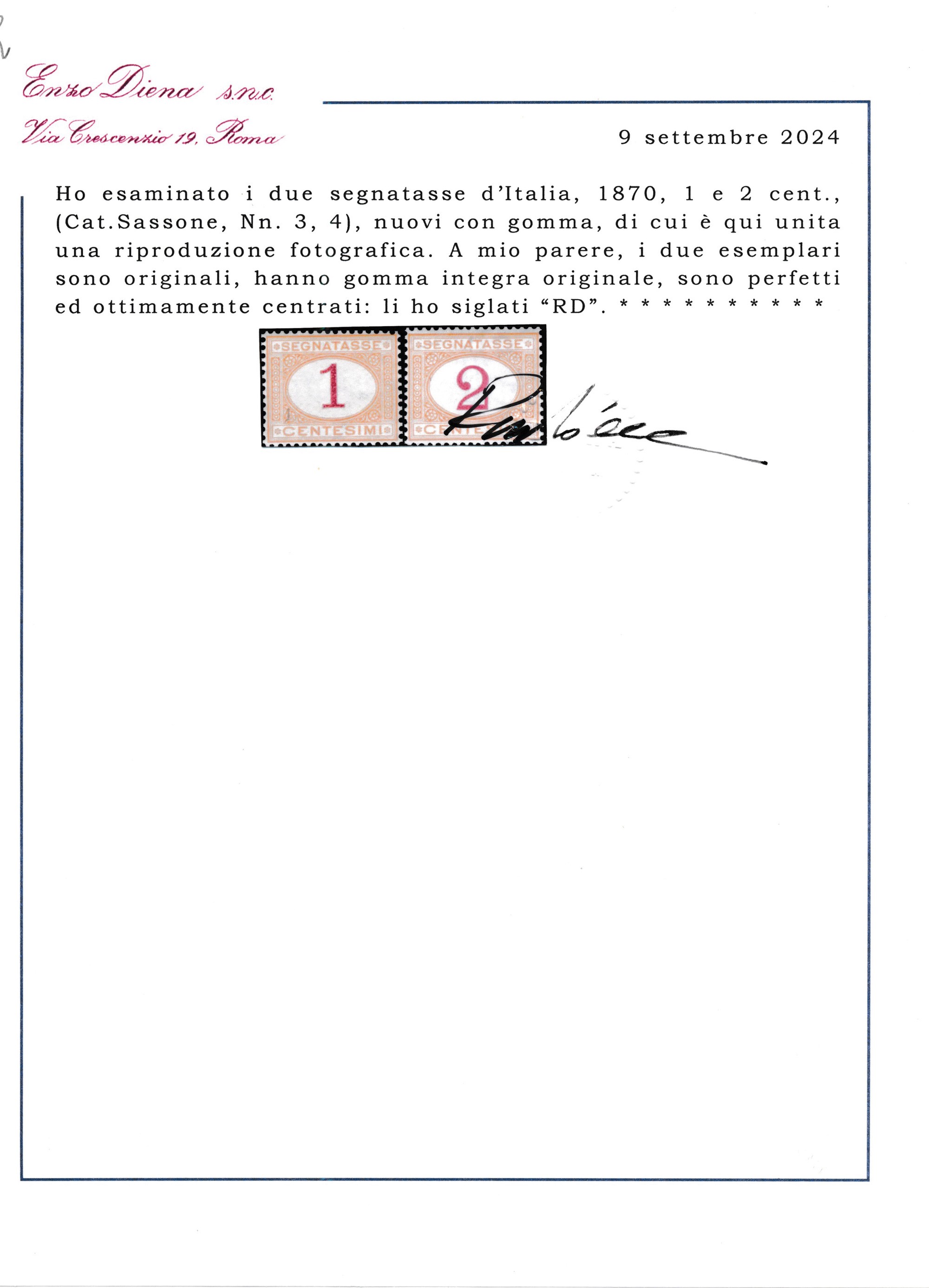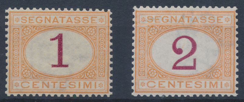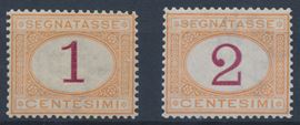 1870 – Regno d’Italia – Segnatasse – 1 e 2 cent. ocra e carminio (Sass. 3 e 4).