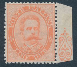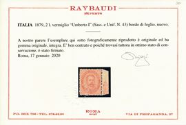 1879 - Regno d’Italia – 2 lire vermiglio “Umberto I”, gomma integra, bdf (Sass. 43).