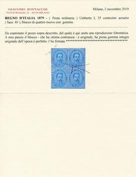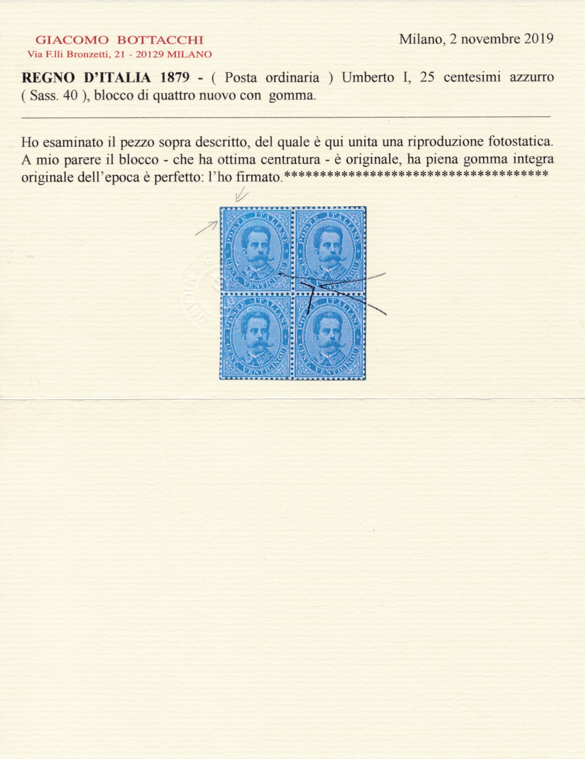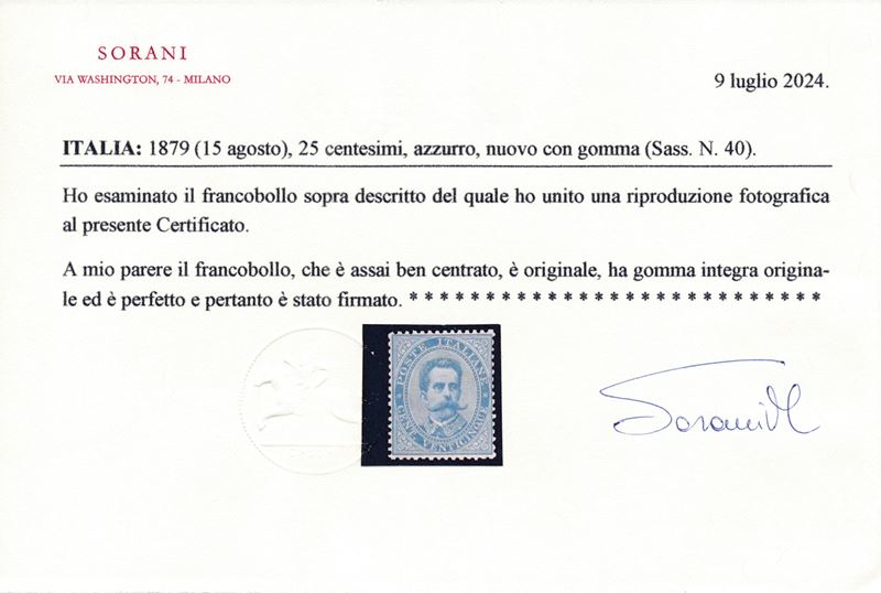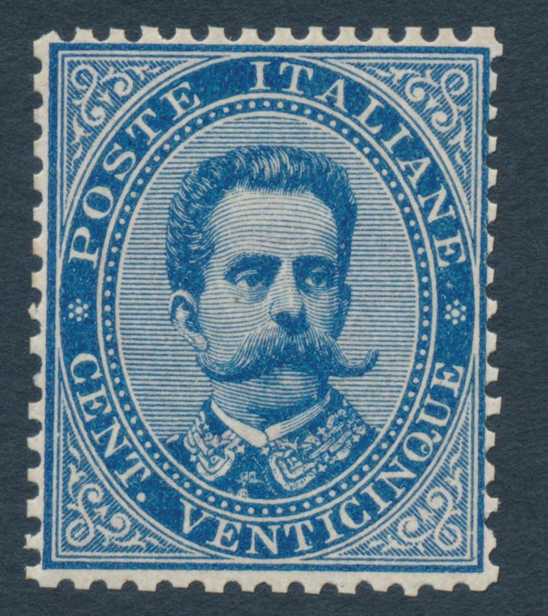 1879 - Regno d’Italia – 25 cent. azzurro “Umberto I”, gomma integra (Sass. 40).