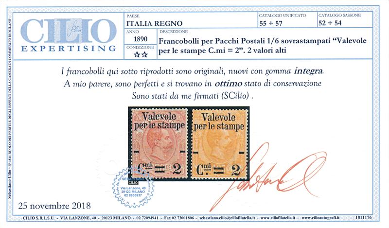1890 – Regno d’Italia – Francobolli per pacchi postali “Valevole per le stampe”, serie completa, gomma integra (Sass. S.6 [..]